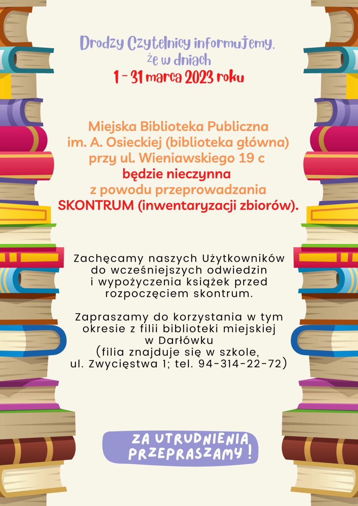 Miejska Biblioteka Publiczna im. A. Osieckiej (biblioteka główna) przy ul. Wieniawskiego 19 c będzie nieczynna z powodu przeprowadzania SKONTRUM (inwentaryzacji zbiorów) w okresie 1 – 31 marca 2023 roku.