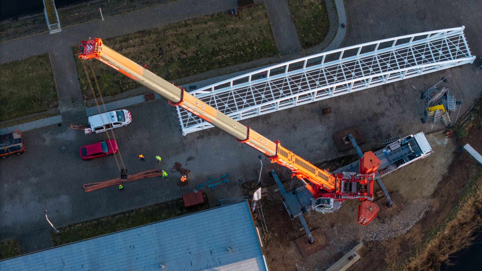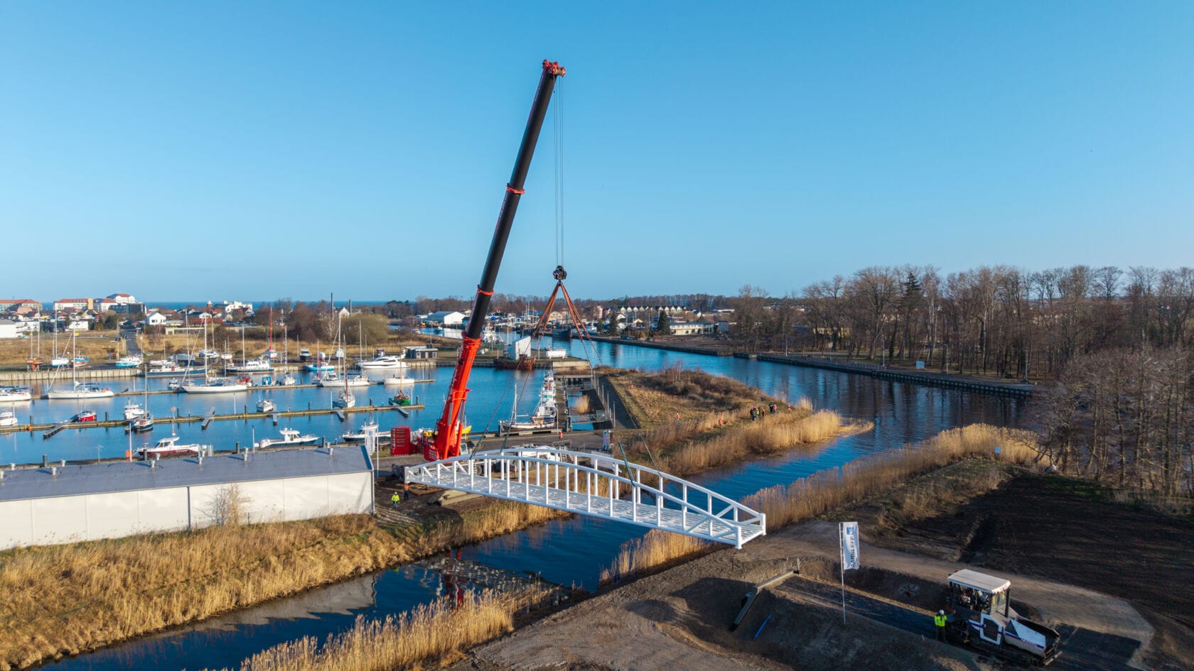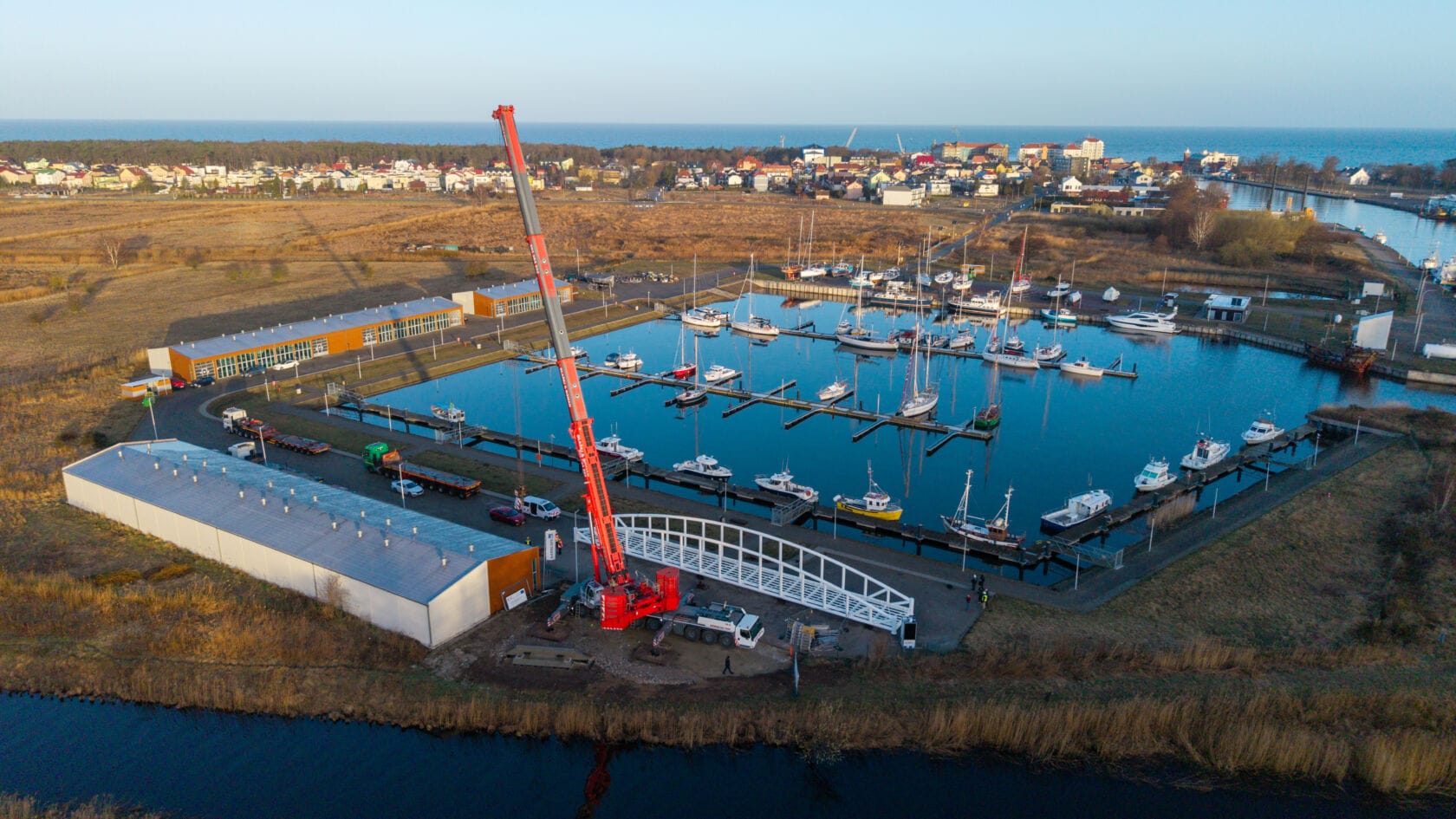 31 marca o godzinie 7:00 rozpoczęto montaż konstrukcji nowego mostu pieszo-rowerowego, który połączy dwie części portu położone po zachodniej stronie miasta. To ważny etap inwestycji realizowanej w ramach szerszego projektu, pn. „Modernizacja i rozbudowa obiektów hydrotechnicznych w Porcie Morskim w Darłowie na potrzeby obsługi i konserwacji instalacji wiatrowych na morzu”.