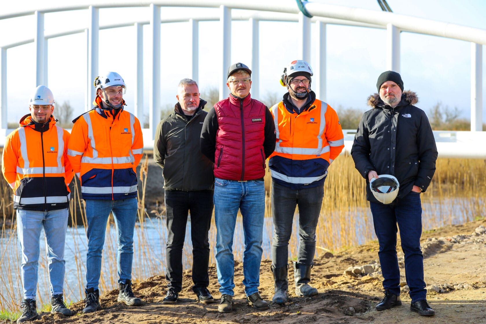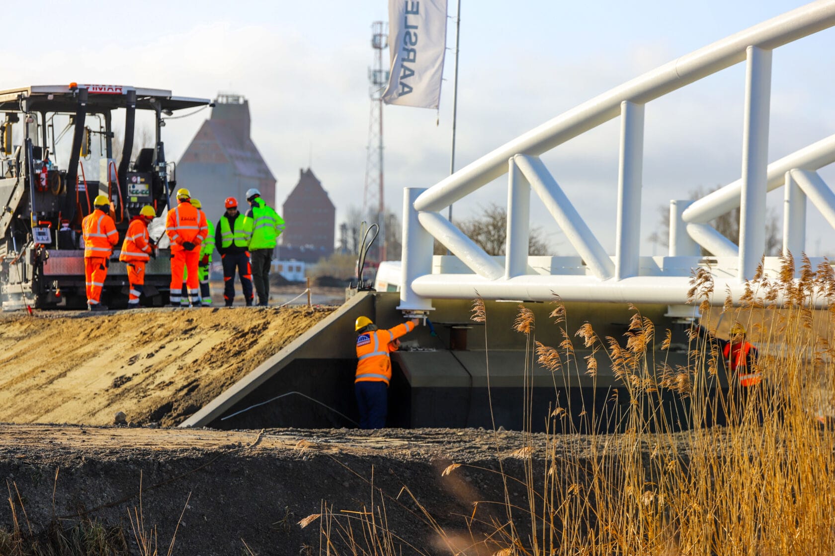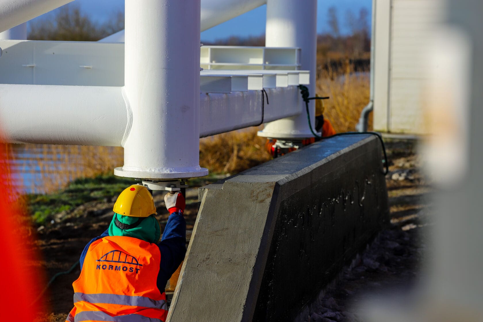 Wykonawcą zadania (budowy mostu i drogi) jest firma AARSLEF Sp. z o.o. Przedsięwzięcie realizowane jest na podstawie umowy nr 9/2025, którą została zawarta w dniu 30 lipca 2025 roku. Koszt realizacji mostu oraz drogi dojazdowej wynosi 8 513 372,57 zł, z czego 4 827 392,68 zł stanowi dofinansowanie ze środków w ramach Krajowego Planu Odbudowy i Zwiększania Odporności, w ramach inwestycji B.2.2.3 dotyczącej budowy infrastruktury terminalowej offshore. Roboty budowlane w ramach tej części projektu zakończone zostaną w miesiącu maju 2026.