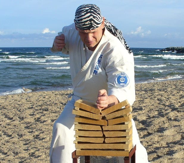 Karateka łamie deski na plaży