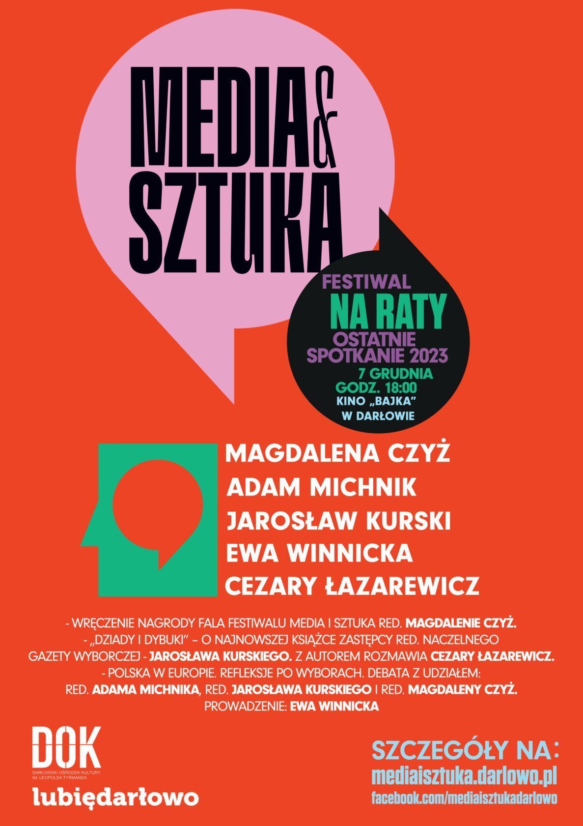 7 grudnia 2023, o godz. 18:00 w kinie Bajka w Darłowie (ul. Morska 56) odbędzie się ostatnie spotkanie z cyklu “Media i Sztuka – Festiwal – edycja na raty”. Wśród gości specjalnych znajdą się Adam Michnik, Jarosław Kurski oraz Magdalena Czyż z “Gazety Wyborczej”, która otrzyma w tym roku otrzyma statuetkę Fali Festiwalu Media i Sztuka. Podczas wydarzenia odbędzie się dyskusja na temat najnowszej książki Jarosława Kurskiego “Dziady i Dybuki”, a następnie “Debata o Polsce”, z udziałem zaproszonych gości, moderowana przez red. Ewę Winnicką.