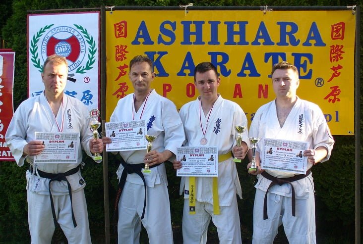 Czterech mężczyzn w karate gi z trofeami Ashihara Karate