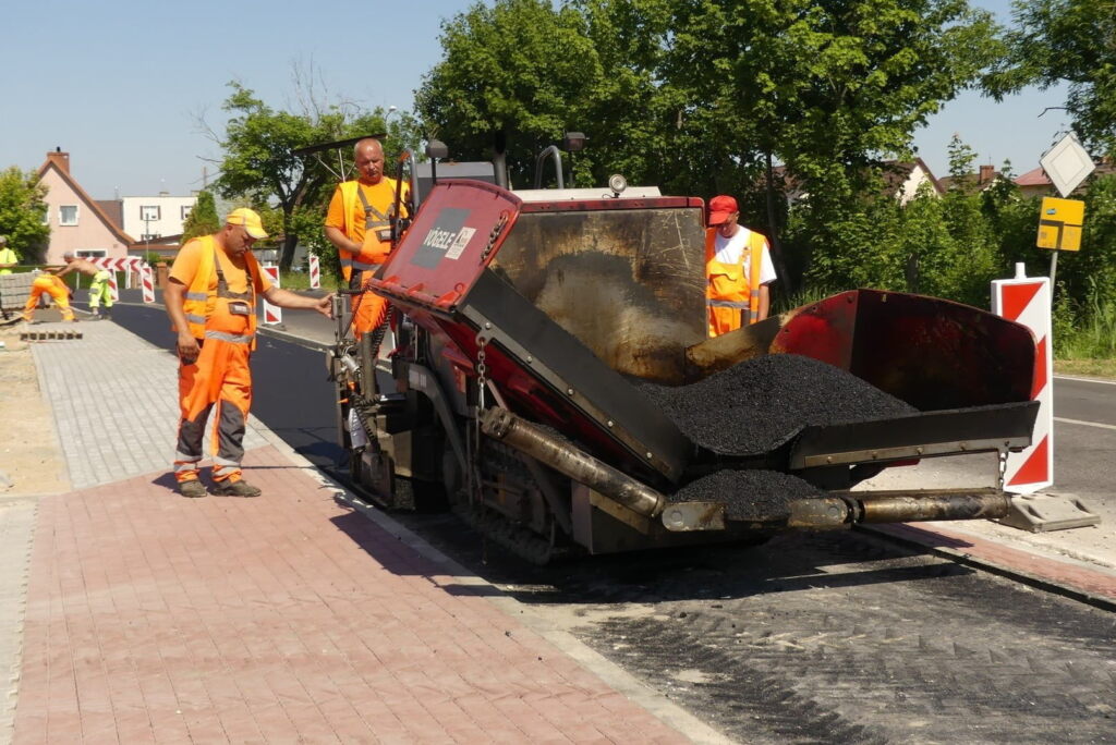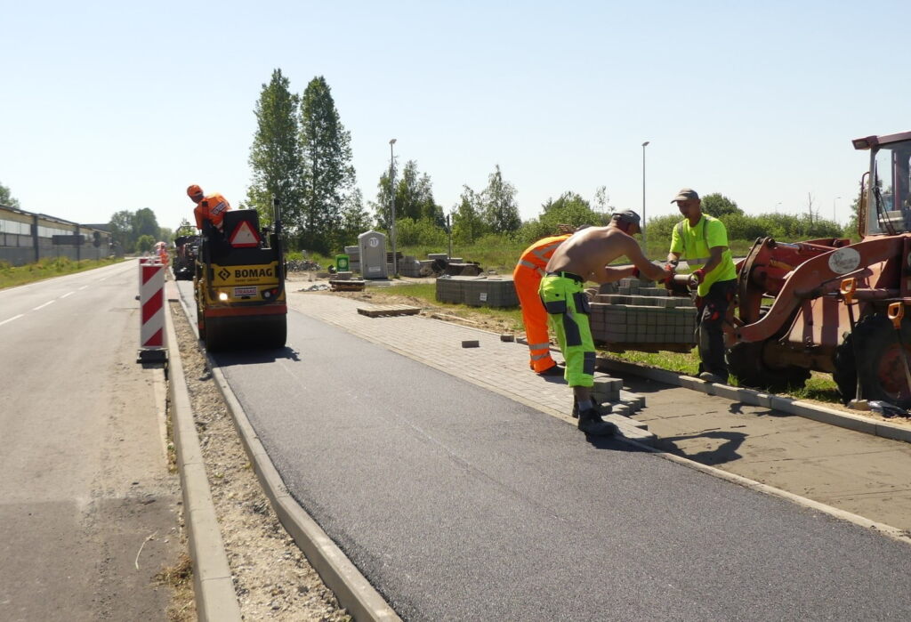 W Darłowie na części ulicy Adama Mickiewicza i gen. Józefa Sowińskiego firma Strabag z Koszalina kładzie asfalt na ścieżce rowerowej i kostkę betonową na chodniku.