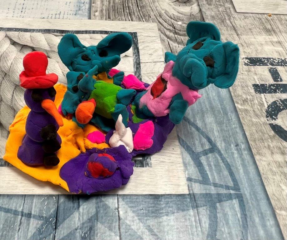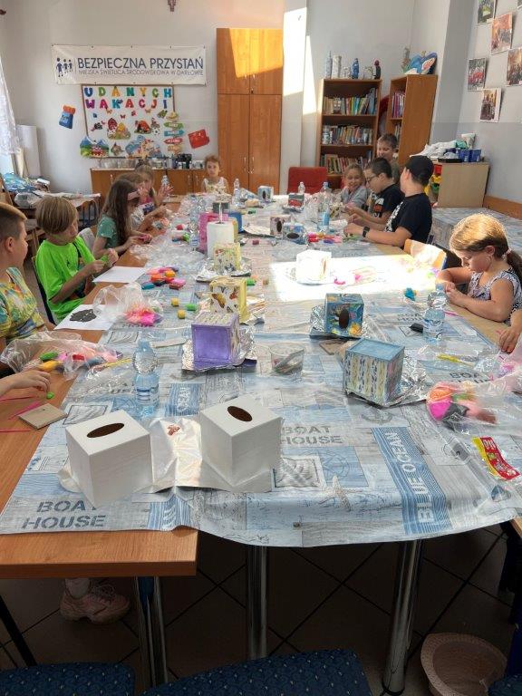 Dzieci miały aktywnie zorganizowany czas na miejskiej świetlicy. Nie martwiliśmy się, że często padał deszcz, ponieważ mieliśmy więcej atrakcji wewnątrz. Stałymi zajęciami podczas półkolonii są gry w cymbergaja i piłkarzyki oraz gry planszowe i budowle ze słomek konstrukcyjnych. Natomiast w trakcie zajęć artystycznych dzieci wykonały chusteczniki.