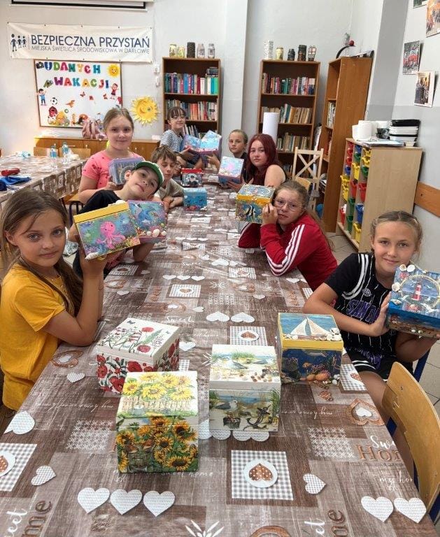 W czasie tych dwóch tygodni nasi podopieczni korzystali z miejskich placów zabaw i boiska szkolnego, a na świetlicy rywalizowali w konkurencjach plastycznych i sportowych. W czasie zajęć kulinarnych zajadały się goframi, a w czasie zajęć artystycznych stworzyły morskie pudełka metodą decoupage.