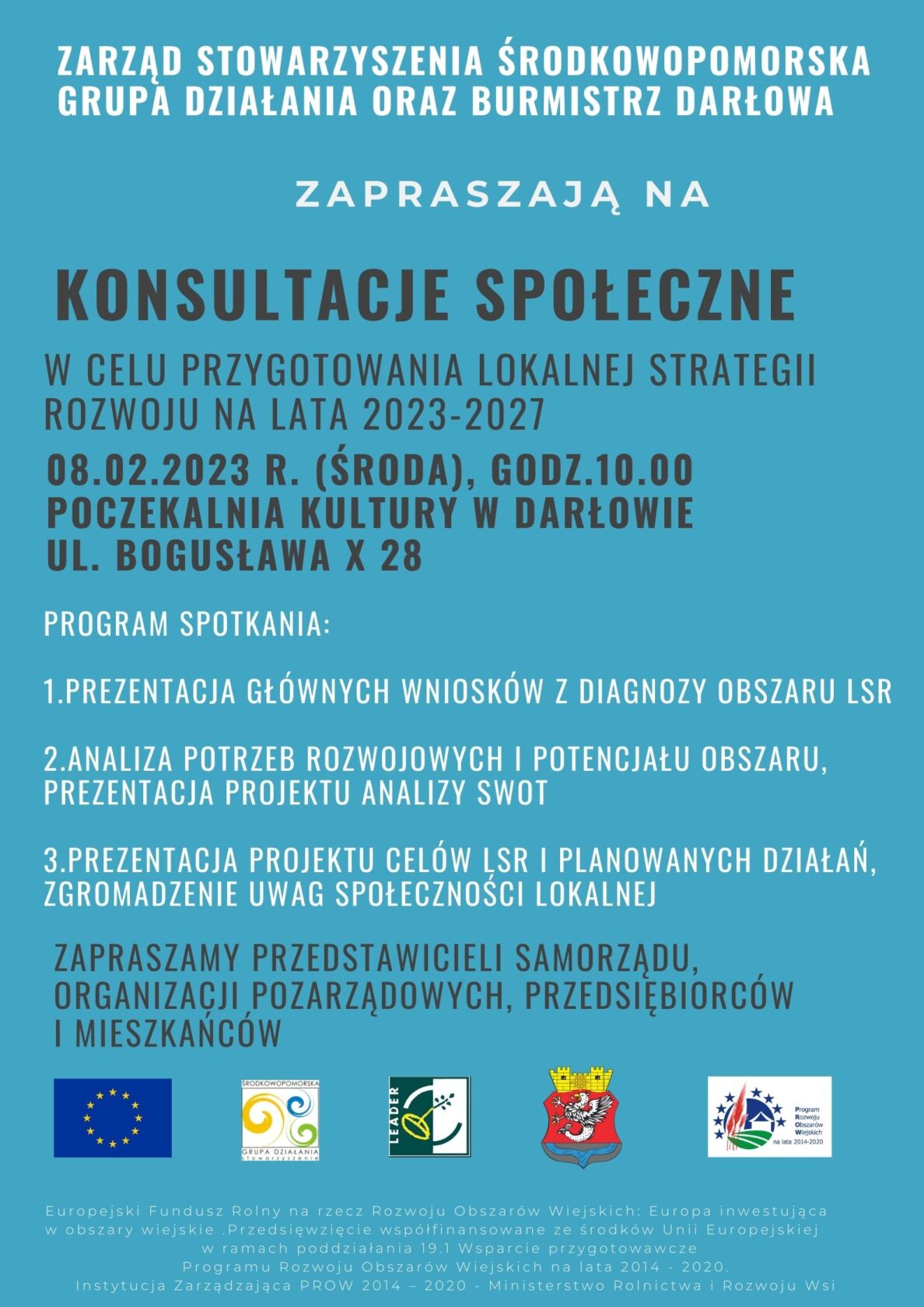 Zarząd Stowarzyszenia Środkowopomorska Grupa Działania oraz Burmistrz Miasta Darłowo serdecznie zapraszają na konsultacje społeczne w celu przygotowania Lokalnej Strategii Rozwoju na lata 2023-2027.