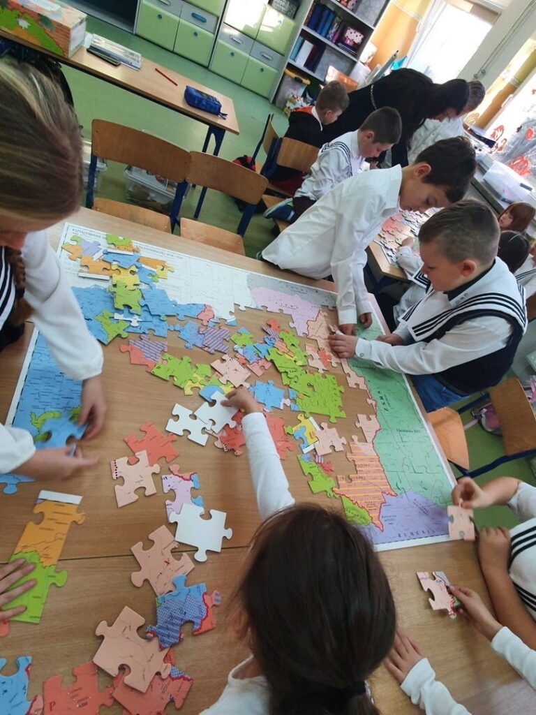 Dzieci w szkole układają dużą mapę-puzzle Europy.
