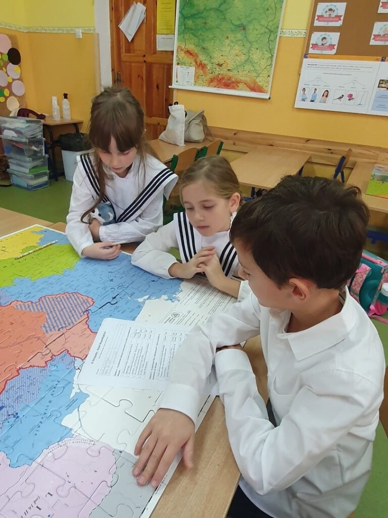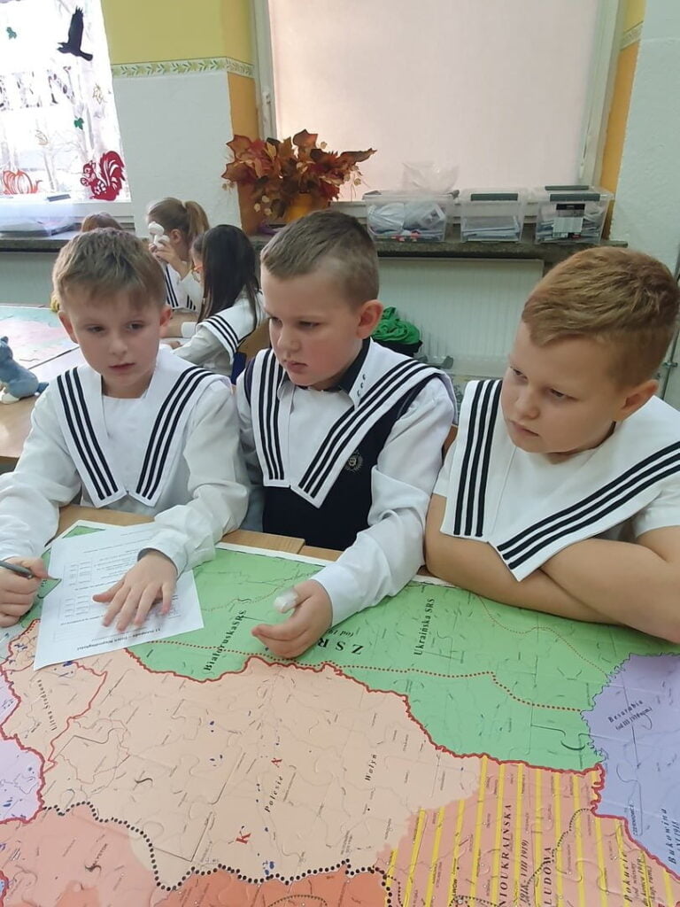 Uczniowie klasy 2D ze Szkoły Podstawowej nr 3 w Darłowie szukali odpowiedzi na wiele pytań związanych z historią Polski pod czujnym i fachowym okiem taty Karola – Pana Rafała – nauczyciela historii w Zespole Szkół Morskich w Darłowie. Uczniowie oglądali filmy edukacyjne, rozwiązywali zadania w kartach pracy i układali puzzle – mapę Polski z czasów odzyskania wolności.