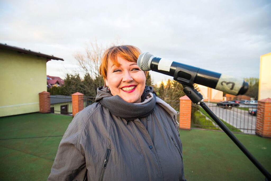 Uśmiechnięta kobieta mówiąca do mikrofonu na zewnątrz
