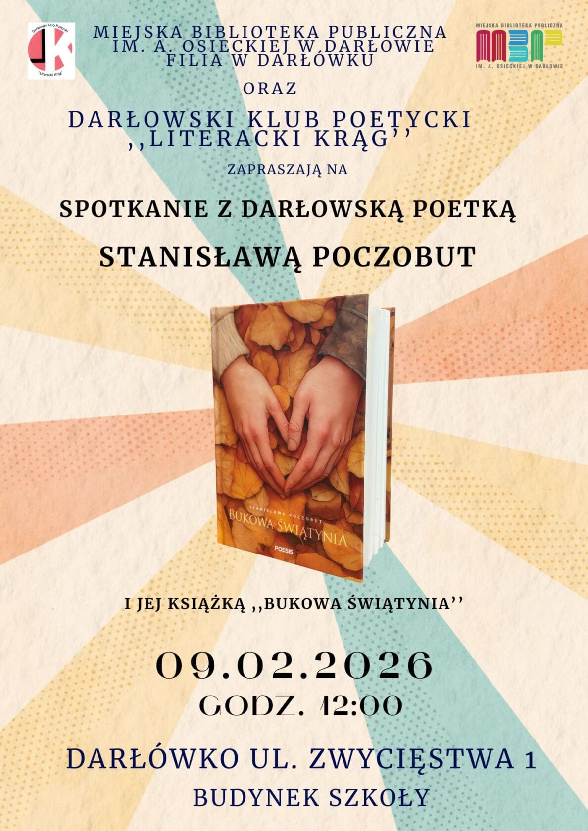Zapraszamy na wyjątkowe spotkanie z poezją!Stanisława Poczobut, autorka wierszy, która od niedawna mieszka w Darłówku, przyjedzie do nas z premierowym tomem poezji „Bukowa świątynia”. Jej wiersze zachęcają do podróży w głąb ludzkiej natury, gdzie skrywa się nieoczywiste piękno zwykłych dni. Jeśli poszukujesz wzruszeń i okazji do przemyśleń, koniecznie przyjdź na spotkanie.Inicjatorem spotkania jest Darłowski Klub […]