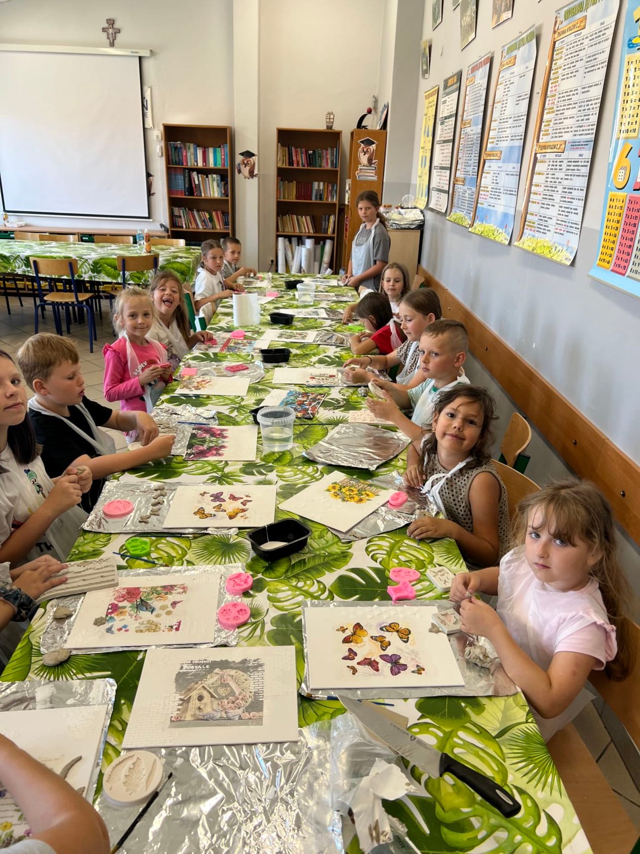 W części plastycznej dzieci wykonywały prace w technikach mix media i decoupage. W programie znalazły się też atrakcje wyjazdowe – alpakoterapia na „Sosnowych Wzgórzach”, wspólna gra w kręgle oraz wyjścia na lody.