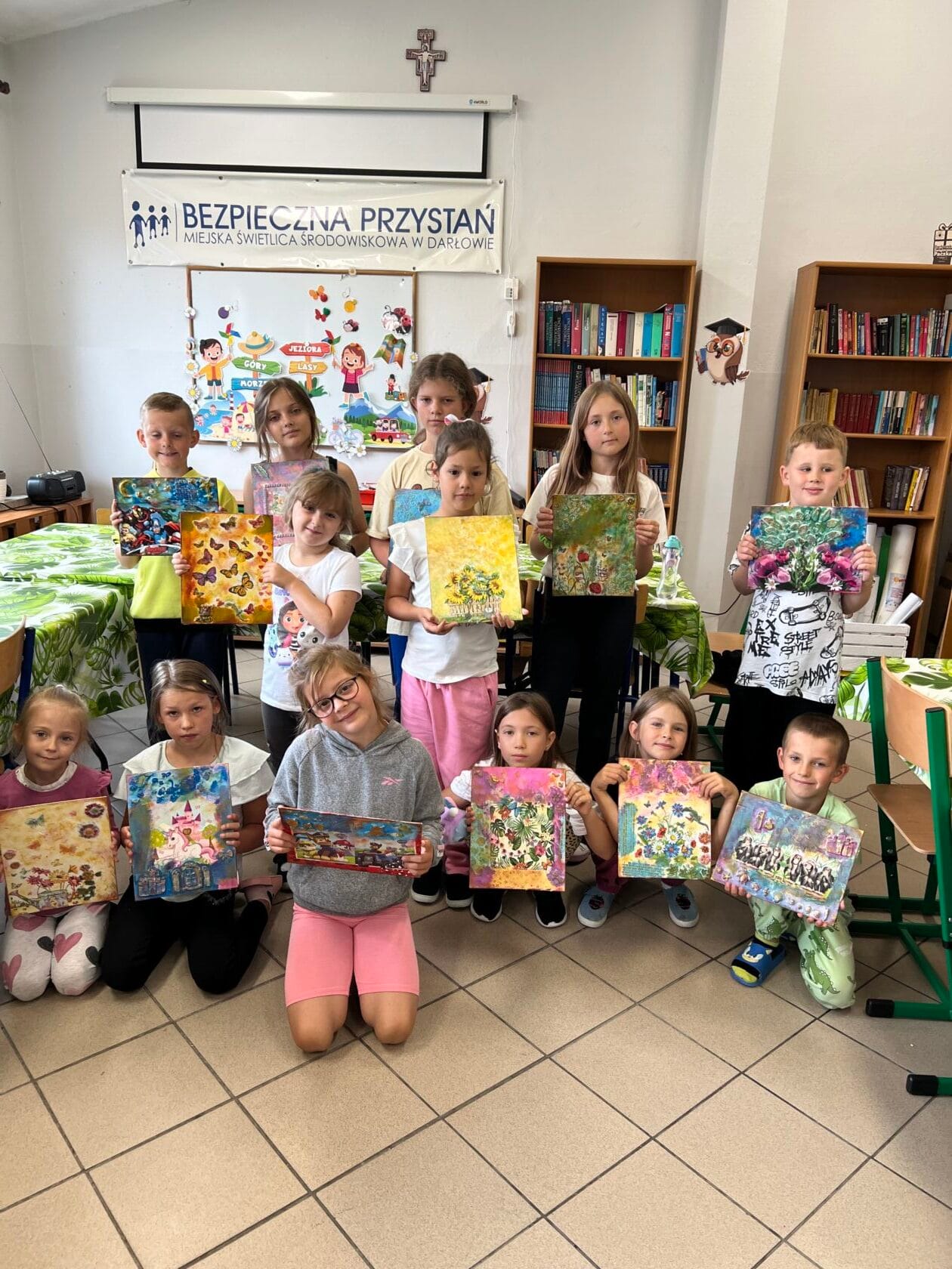 W części plastycznej dzieci wykonywały prace w technikach mix media i decoupage. W programie znalazły się też atrakcje wyjazdowe – alpakoterapia na „Sosnowych Wzgórzach”, wspólna gra w kręgle oraz wyjścia na lody.