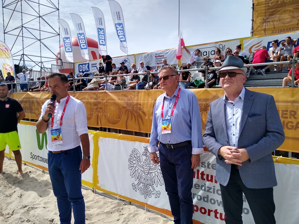 Mężczyźni w garniturach na plażowym wydarzeniu sportowym