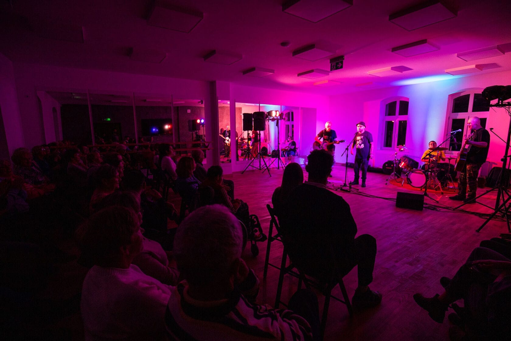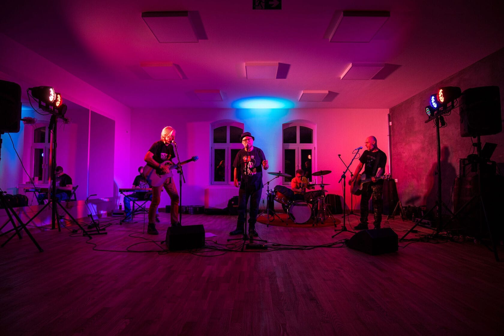 Koncert zespołu muzyki na żywo w oświetlonej sali
