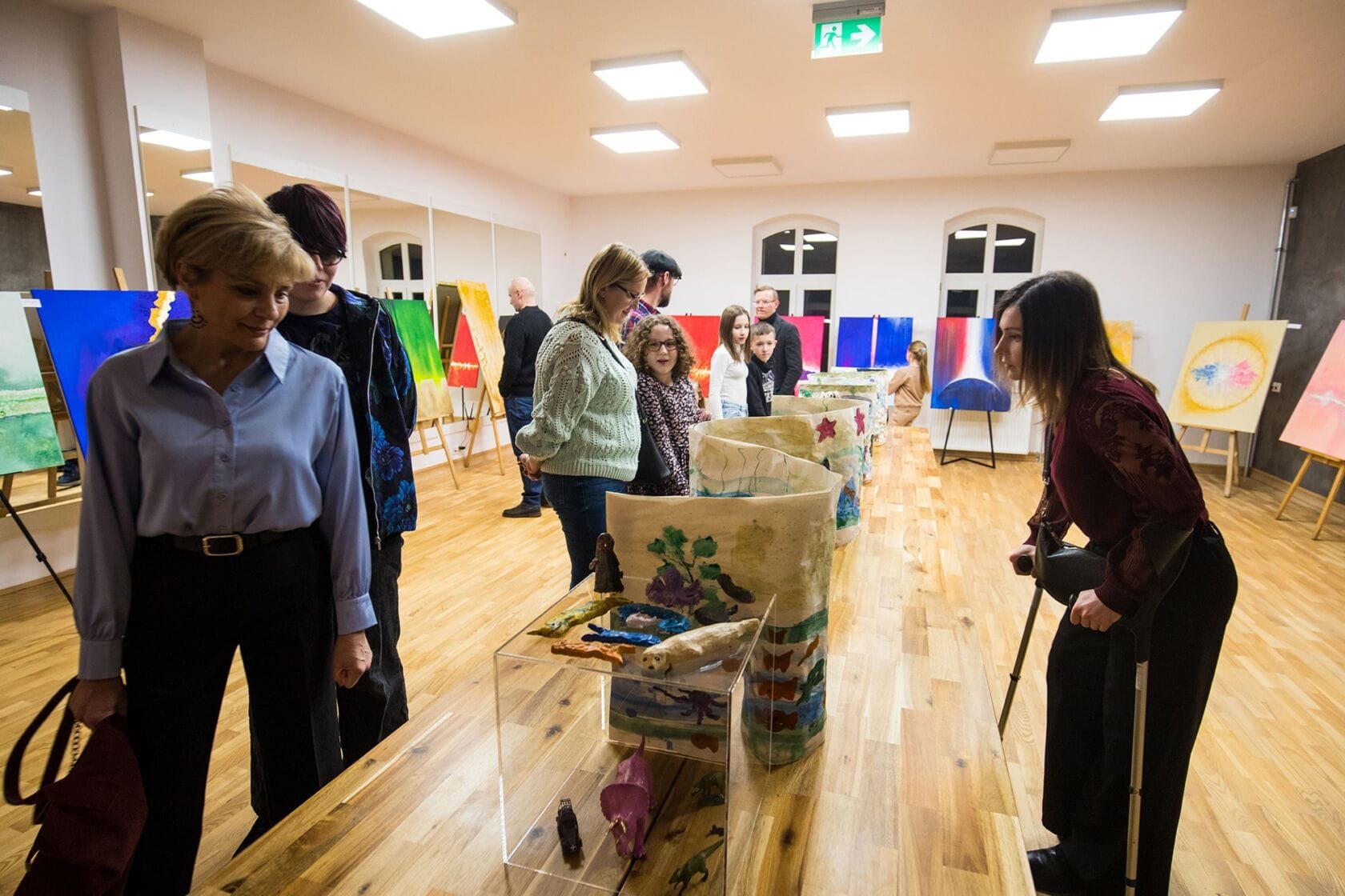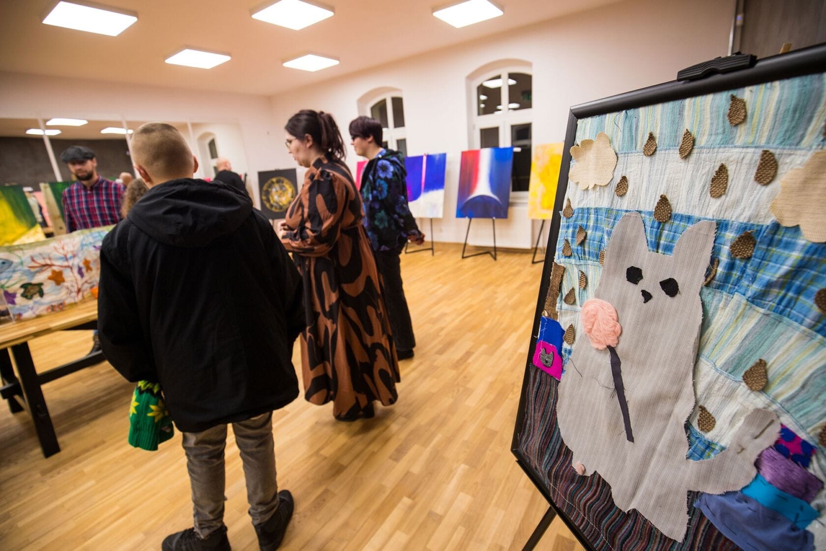Odwiedzający oglądają prace na wystawie artystycznej