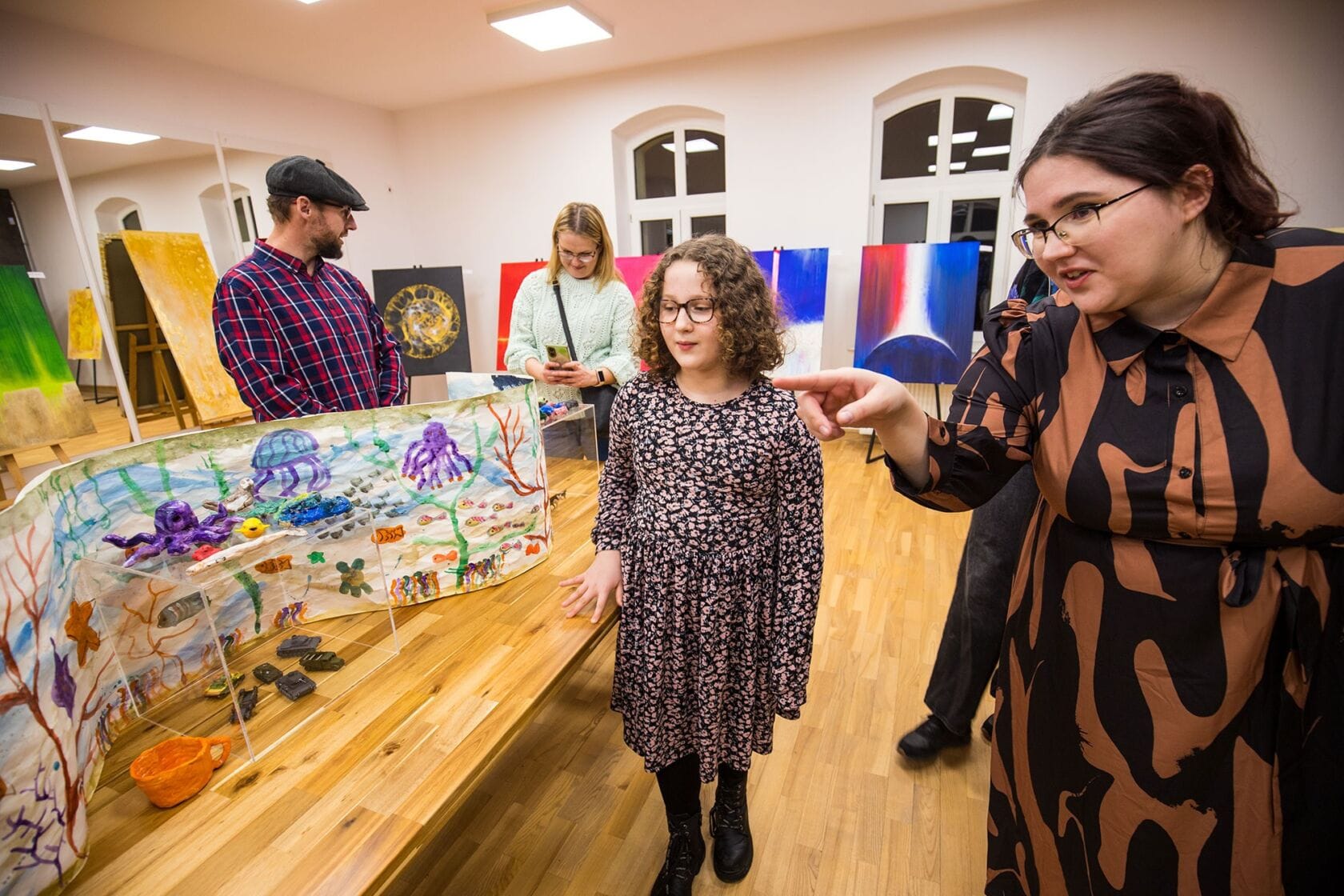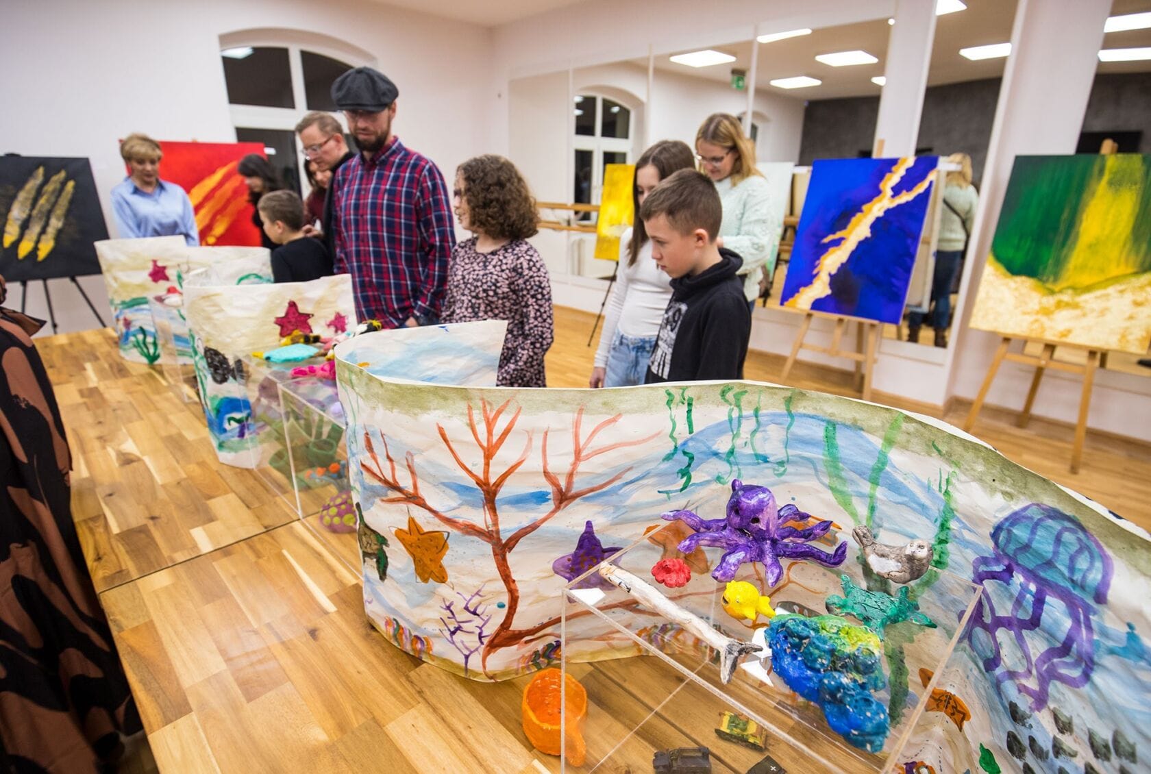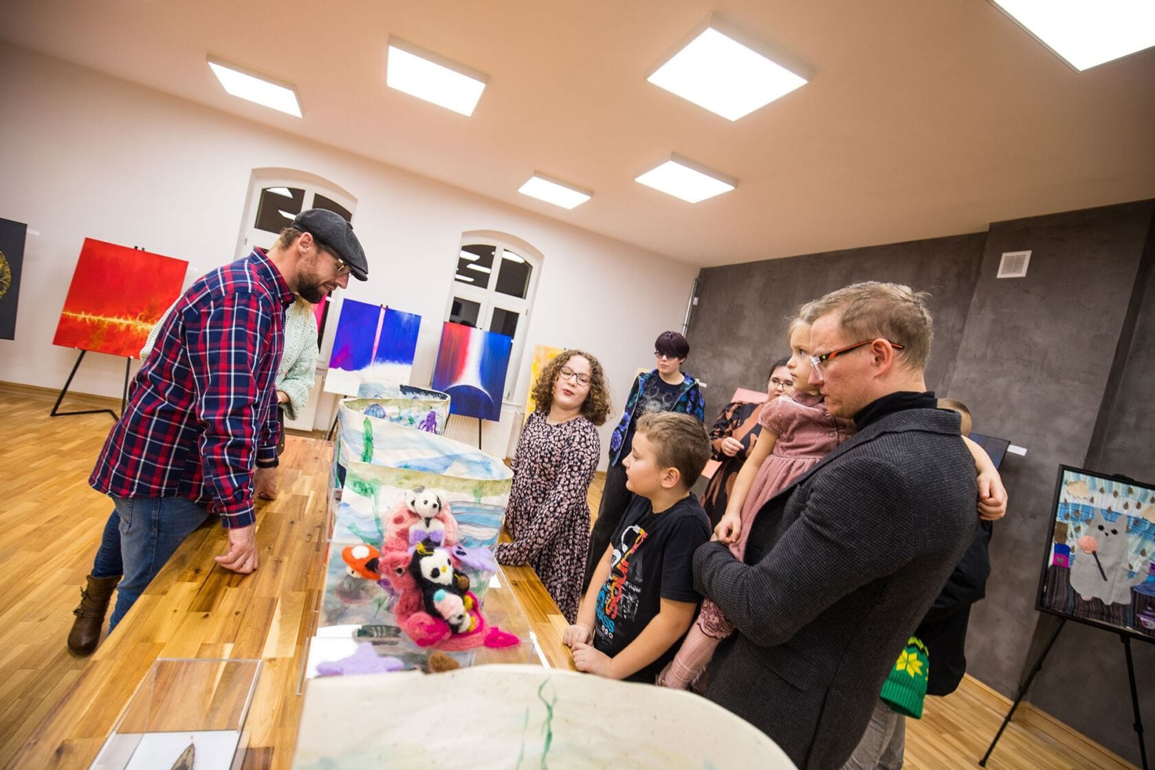 Szeroko pojęta sztuka, twórcza wolność w formach i technikach owocowały wystawą, w której dominowały soczyste, odważne i wyraźne kolory. Artyści na swój wernisaż (21.02.2025) zaprosili rodziców. Nie zabrakło instruktorów prowadzących: Anny Grabowskiej, Artura Hamerlinga, Iwony Hukały, Agaty Piłat i Magdy Zawadki, która koordynowała program tegorocznych ferii.