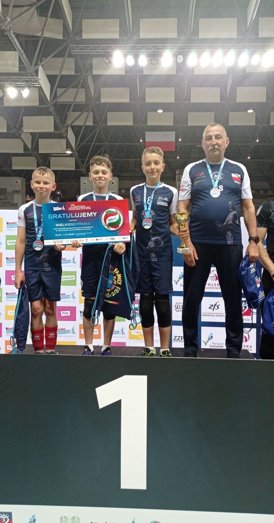 Młodzi sportowcy i trener na podium z trofeami