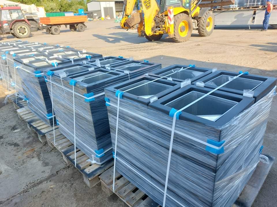 Zakupiono łącznie 160 sztuk koszy ulicznych (140 sztuk koszy ulicznych bez daszku oraz 20 sztuk koszy ulicznych z daszkiem) wykonanych z betonu gładkiego malowanego.