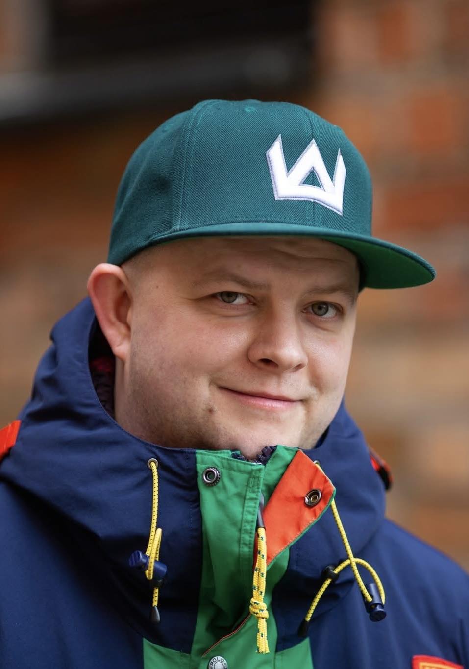 Mężczyzna w zielonej czapce i kolorowej kurtce