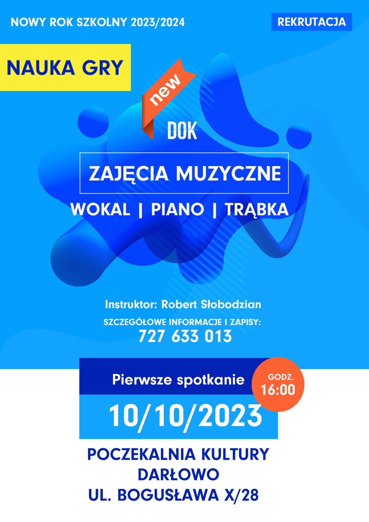3 października 2023 roku w Poczekalni Kultury odbyło się pierwsze spotkanie z nowym instruktorem muzyki. Pan Robert Słobodzian wzmocnił kadrę instruktorską Darłowskiego Ośrodka Kultury.