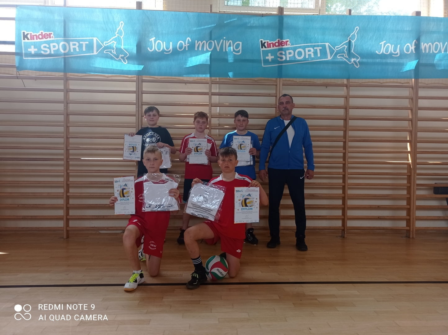 Młodzi sportowcy z dyplomami przy banerze Kinder+Sport