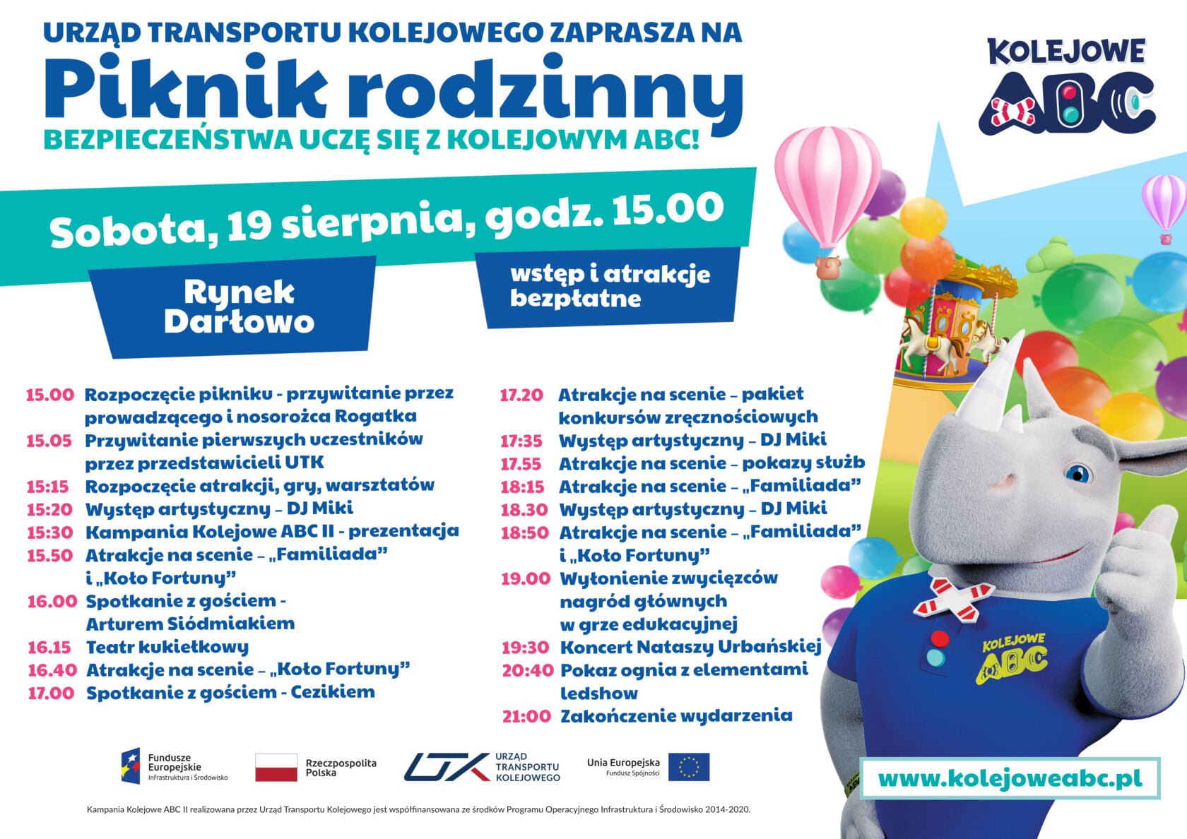 Piknik organizowany w ramach Kampanii Kolejowe ABC II realizowanej przez Urząd Transportu Kolejowego odbędzie się 19 sierpnia w godz. 15.00 – 21.00 na terenie Rynku w Darłowie. Na uczestników wydarzenia będą czekać m.in. kolejka elektryczna, eurobungee, eksperymenty, quizy, zagadki, warsztaty artystyczne i edukacyjne oraz rozgrywki i zawody rodzinne. Wiodącą atrakcją pikniku będzie gra terenowa Kampanii Kolejowe ABC II, w której poprzez zabawę będzie można utrwalić zasady bezpieczeństwa obowiązujące na terenach kolejowych. Na najlepszych graczy czekają wyjątkowe nagrody, takie jak deskorolka elektryczna, hulajnoga czy deskorolka longboard. Podczas pikniku uczestnicy będą mieli okazję spotkać się z byłym reprezentantem Polski w piłce ręcznej, Arturem Siódmiakiem, oraz youtuberem i wokalistą CeZikiem. Dzień pełen atrakcji zakończy koncert Nataszy Urbańskiej i pokaz ognia z elementami ledshow.