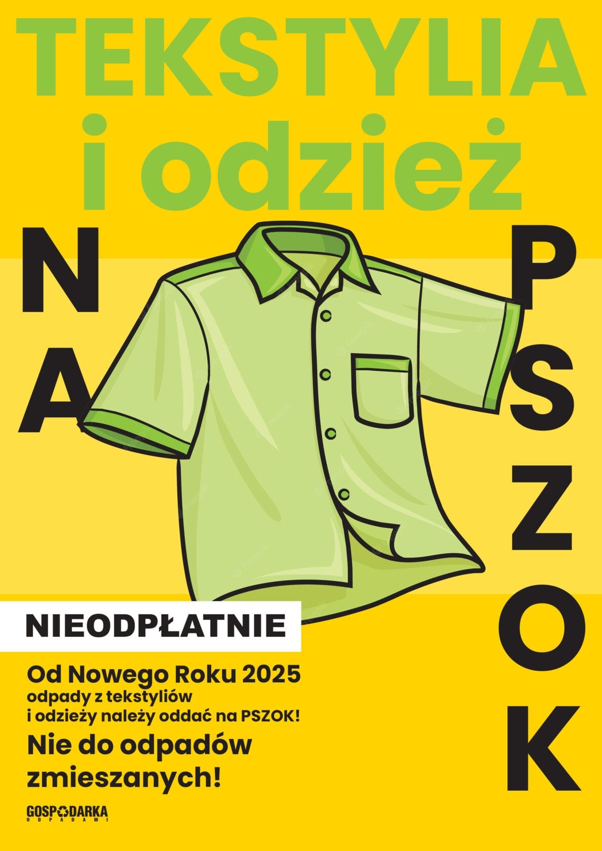 Informujemy, że od Nowego Roku 2025 odpady z tekstyliów i odzieży należy oddać na PSZOK (ul. Fryderyka Chopina 61), czynny w dniach: wtorek i sobota w godzinach: 8:00-16:00.