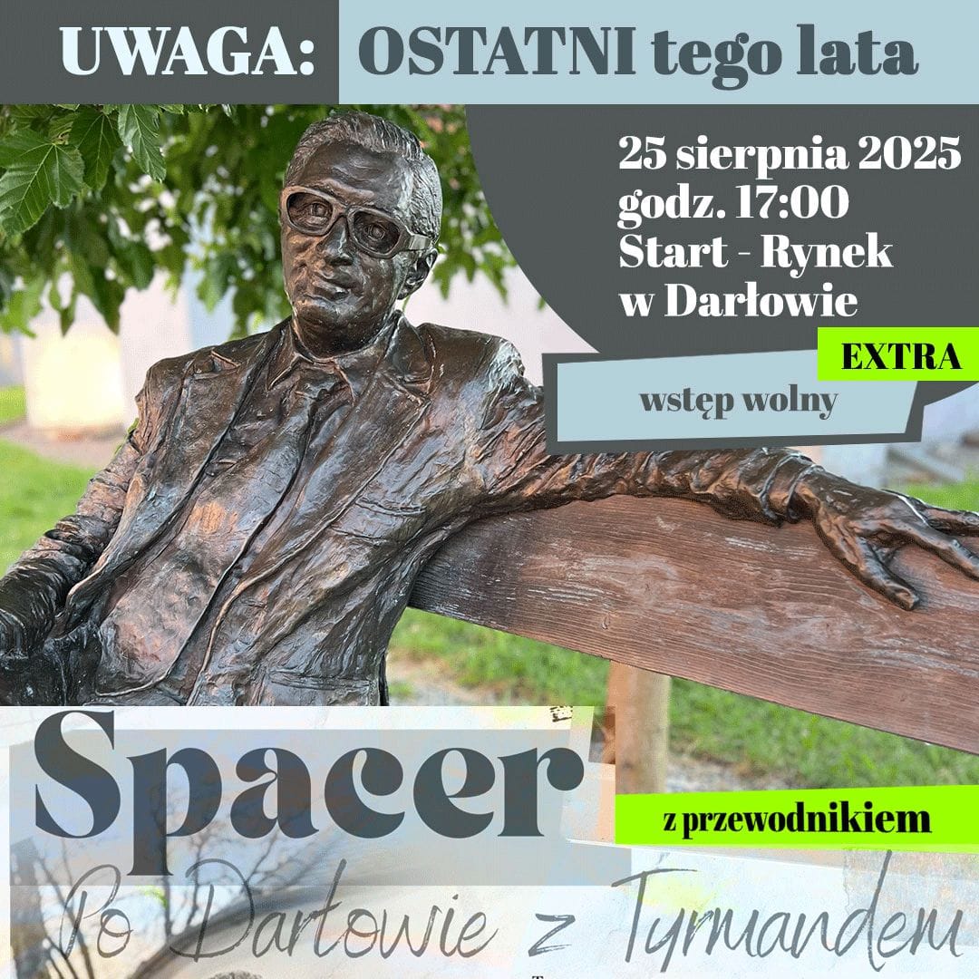Rynek Miejski w Darłowie Plac Kościuszki 9, Darłowo, Zachodniopomorskie, PolandZapraszamy w każdy poniedziałek tego lata do udziału w bezpłatnych wycieczkach po Darłowie. W podróż tę zabierze Państwa licencjonowany przewodnik, na co dzień radna Rady Miejskiej w Darłowie i inicjatorka powstania pierwszej w Polsce ławeczki Leopolda Tyrmanda – Pani Krystyna Różańska. Kiedy? Każdy letni poniedziałek tj.: 14 lipca 2025 21 lipca 2025 28 lipca 2025 […]
