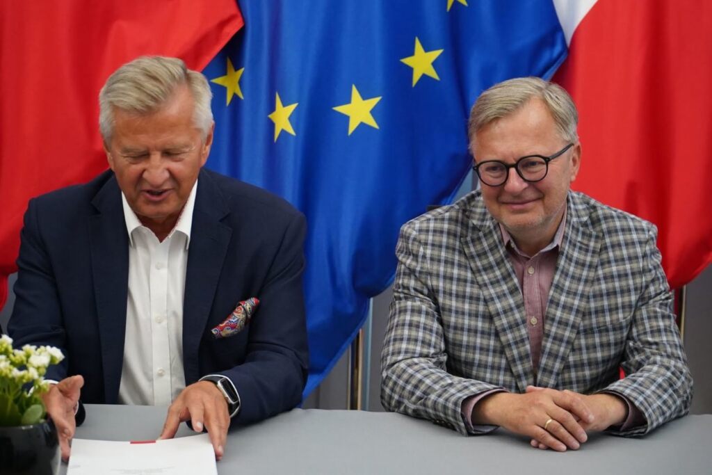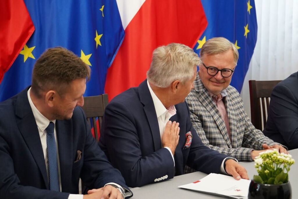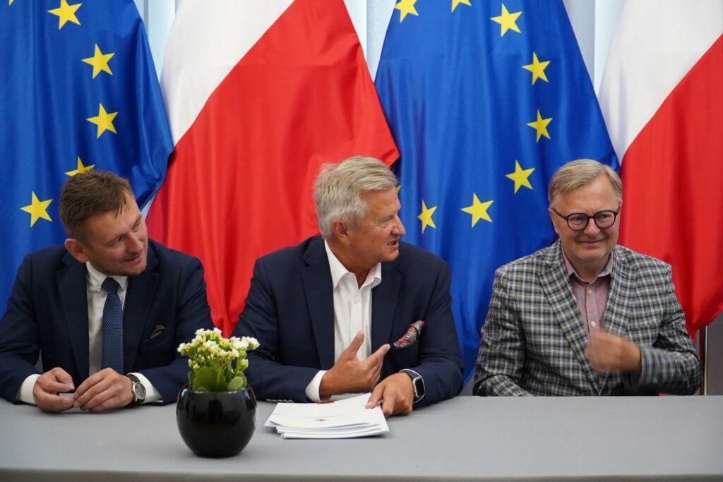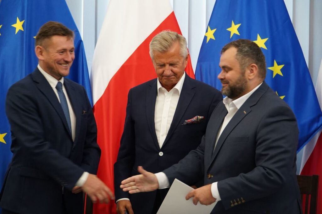 Trzej mężczyźni uśmiechają się, ściskając ręce, flagi UE i Polski