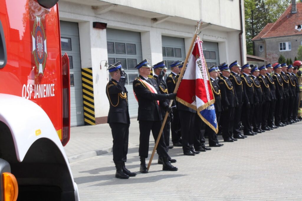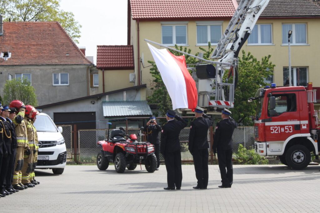 Strażacy, wóz strażacki i polska flaga na drabinie