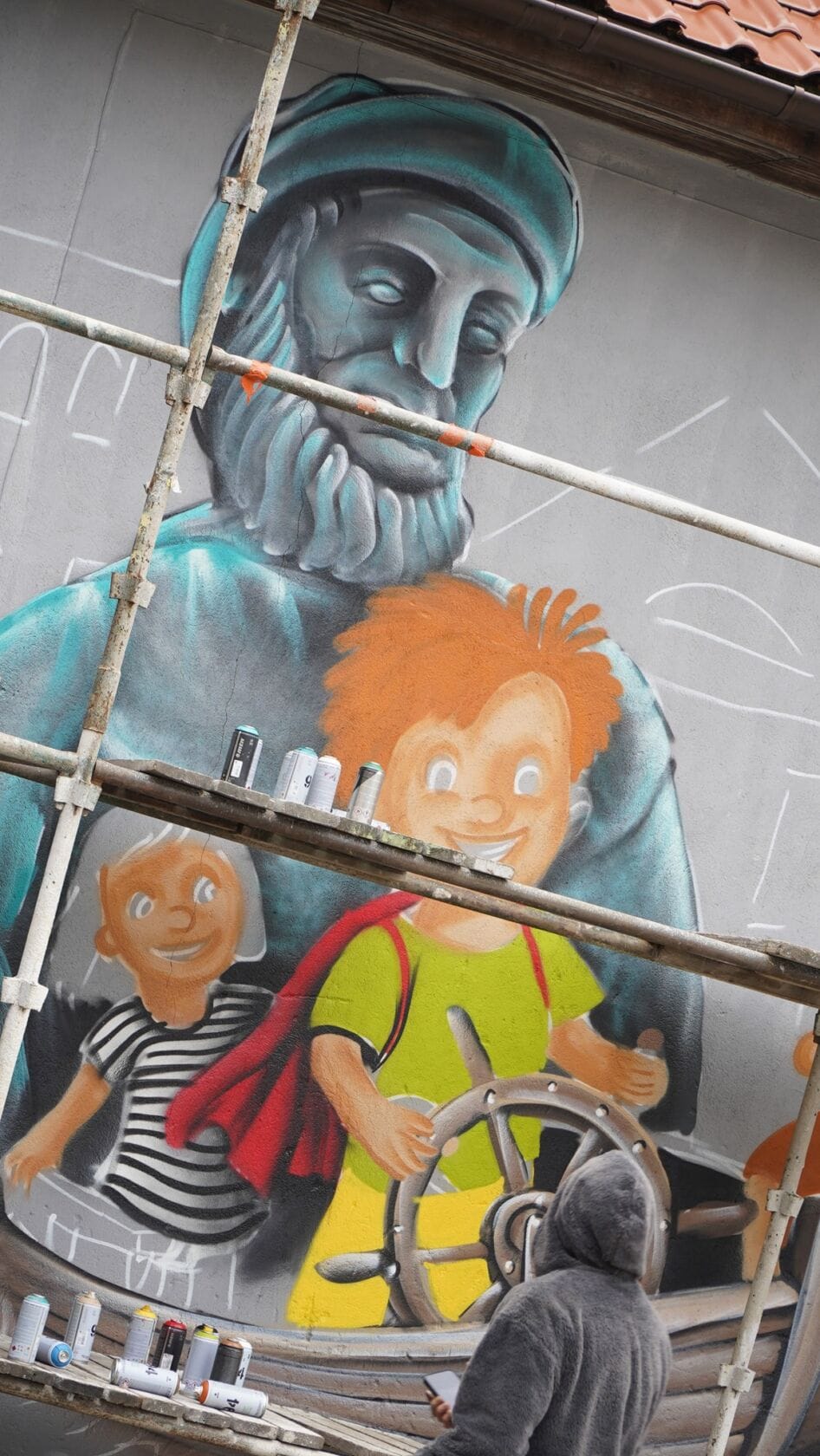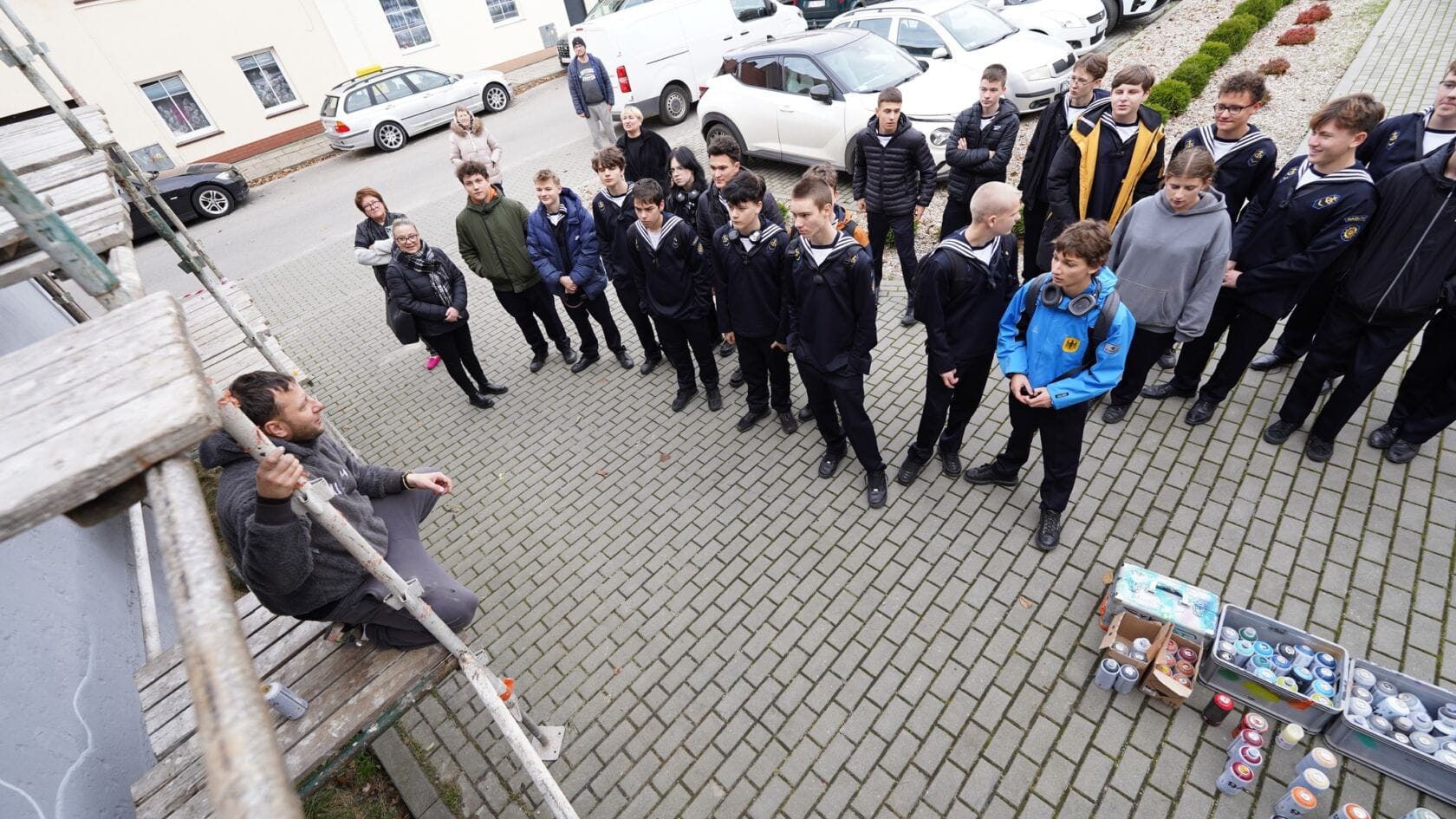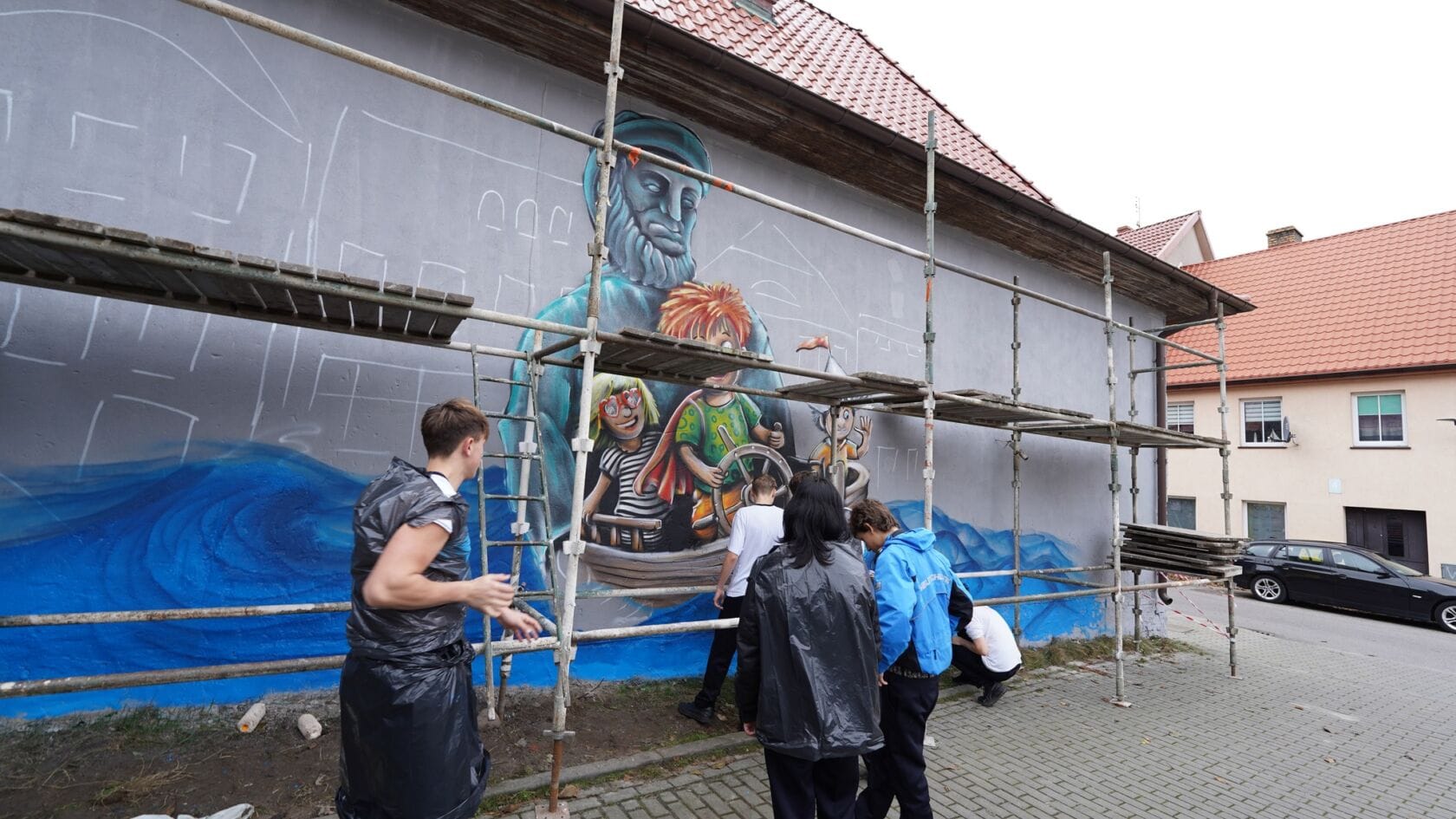 Prace rozpoczęły się późnym wieczorem 2 listopada i od tego czasu mural z dnia na dzień nabiera kształtów. Dziś na miejscu można było zobaczyć nie tylko samego artystę, ale też grupę młodych pomocników. Dołączyli do niego uczniowie Zespołu Szkół Morskich w Darłowie oraz przedszkolaki z „Przedszkola przy Szkole”. Dla wielu z nich było to pierwsze spotkanie z wielkoformatowym malarstwem.