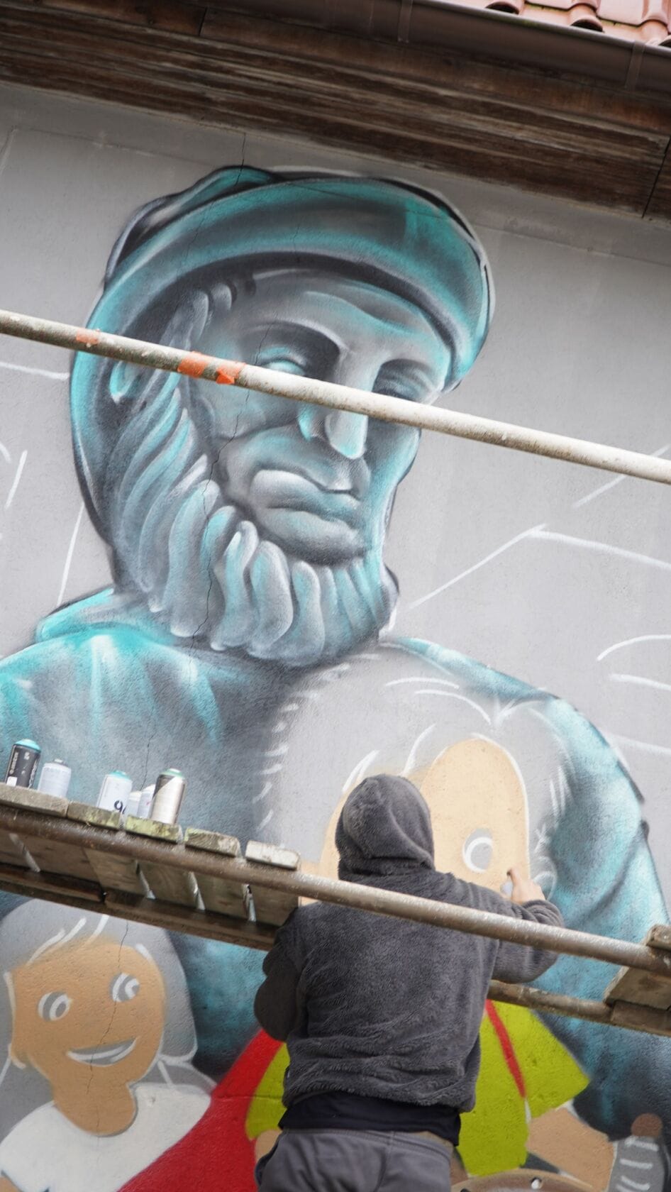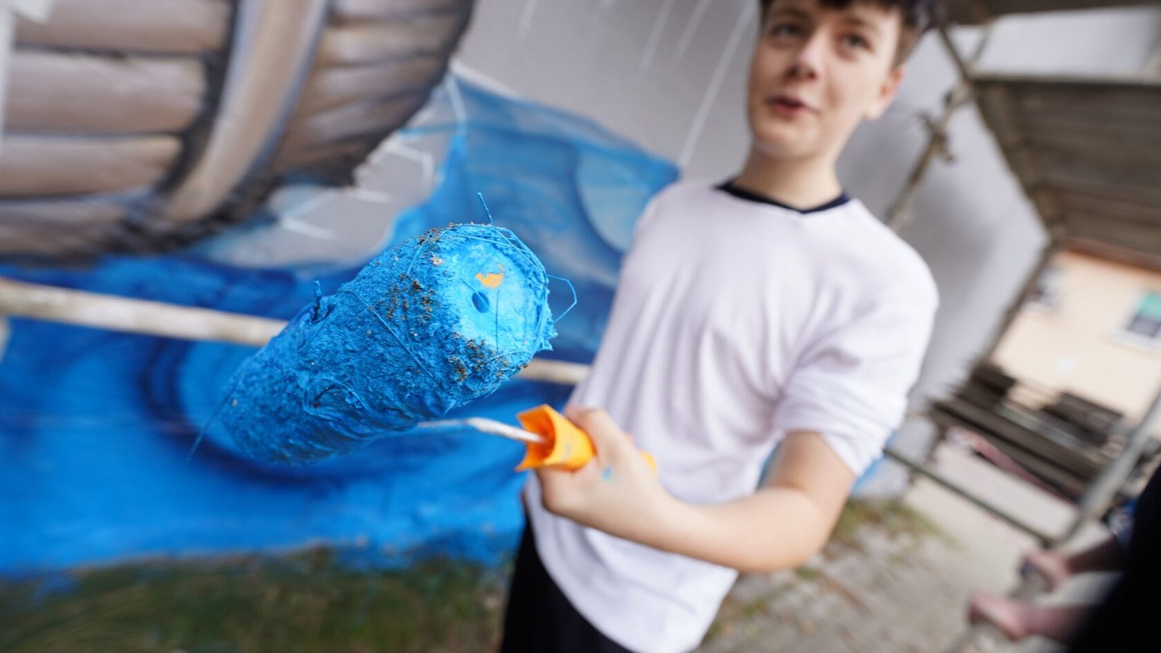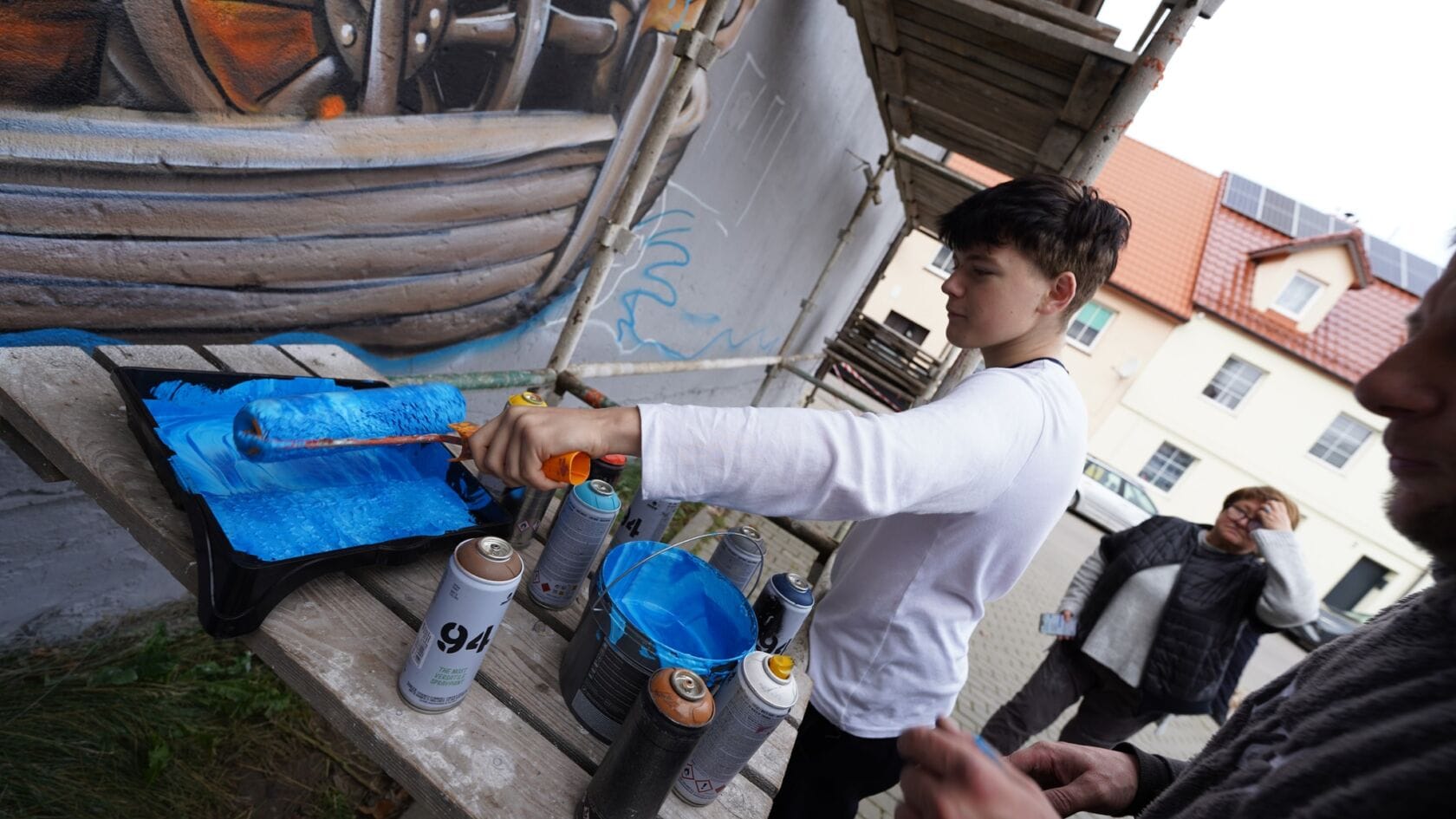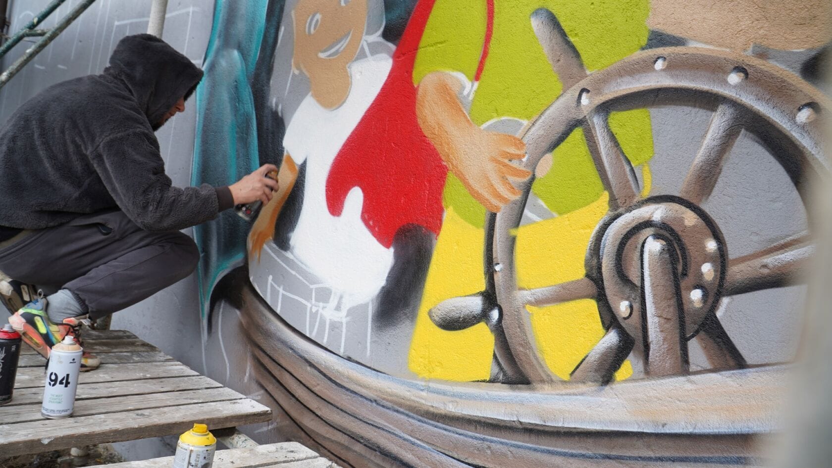 Prace rozpoczęły się późnym wieczorem 2 listopada i od tego czasu mural z dnia na dzień nabiera kształtów. Dziś na miejscu można było zobaczyć nie tylko samego artystę, ale też grupę młodych pomocników. Dołączyli do niego uczniowie Zespołu Szkół Morskich w Darłowie oraz przedszkolaki z „Przedszkola przy Szkole”. Dla wielu z nich było to pierwsze spotkanie z wielkoformatowym malarstwem.