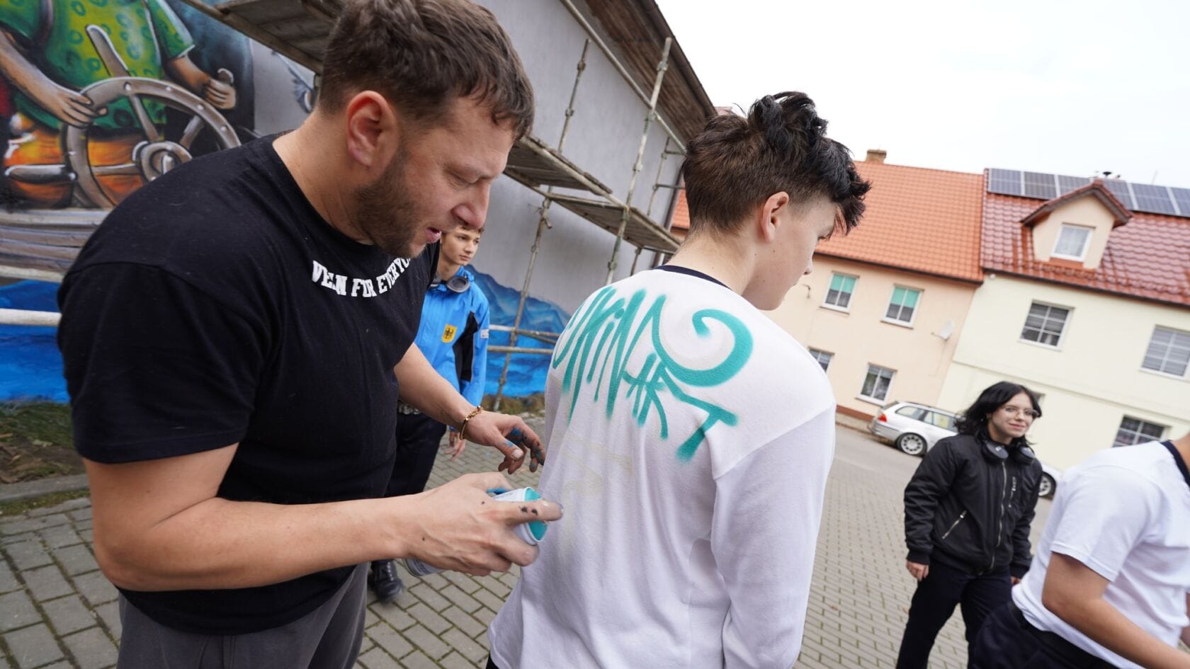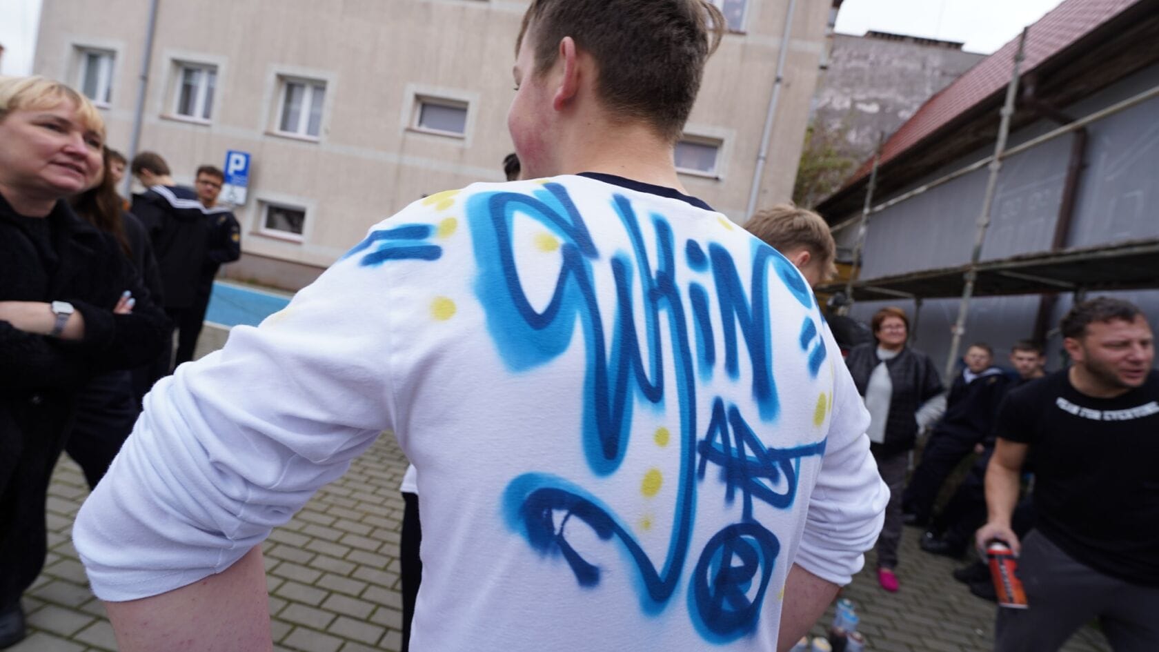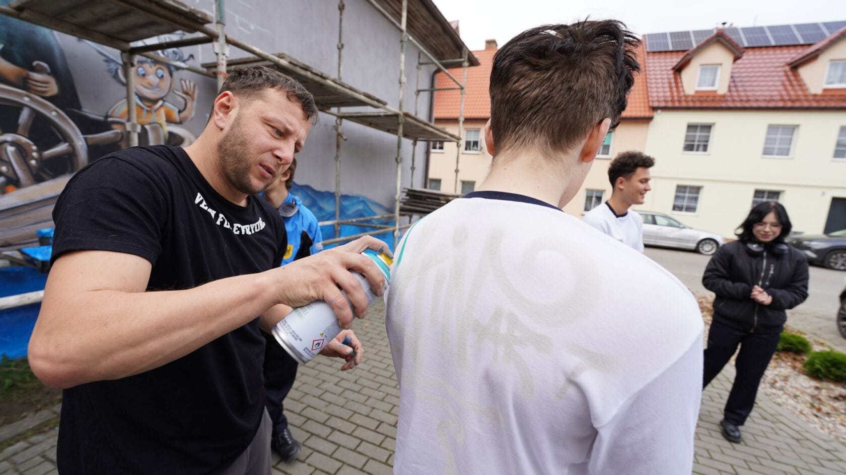 Jak się okazało, nie tylko ściana stała się płótnem. Część uczestników zakończyła dzień z farbą na koszulkach, kurtkach i butach, pamiątka po wspólnej pracy gwarantowana.