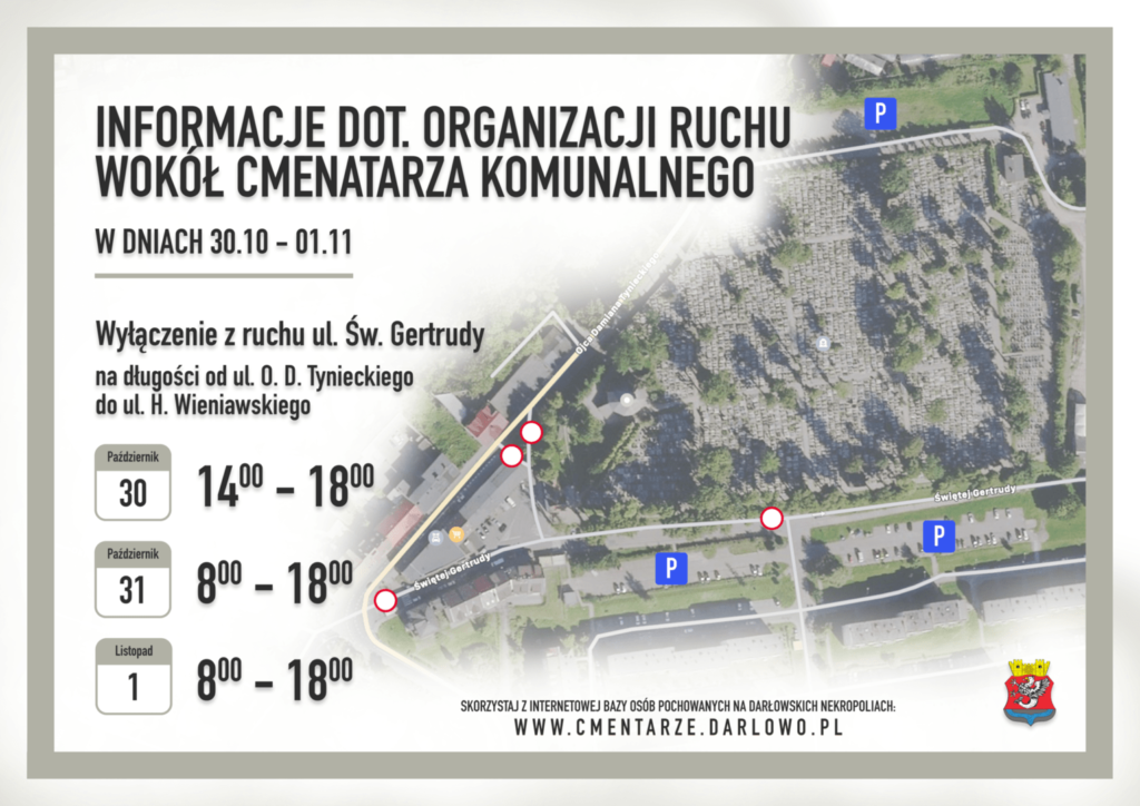 W związku ze zwiększonym natężeniem ruchu pieszego przy głównych wejściach na najstarszą nekropolię w Darłowie zmianie ulegnie organizacja ruchu drogowego. 30 października w godz. 14:00-18:00 i 31 października oraz 1 listopada w godz. 8:00-18:00 zamknięta będzie ul. Św. Gertrudy na długości od ul. O. D. Tynieckiego do ul. H. Wieniawskiego.