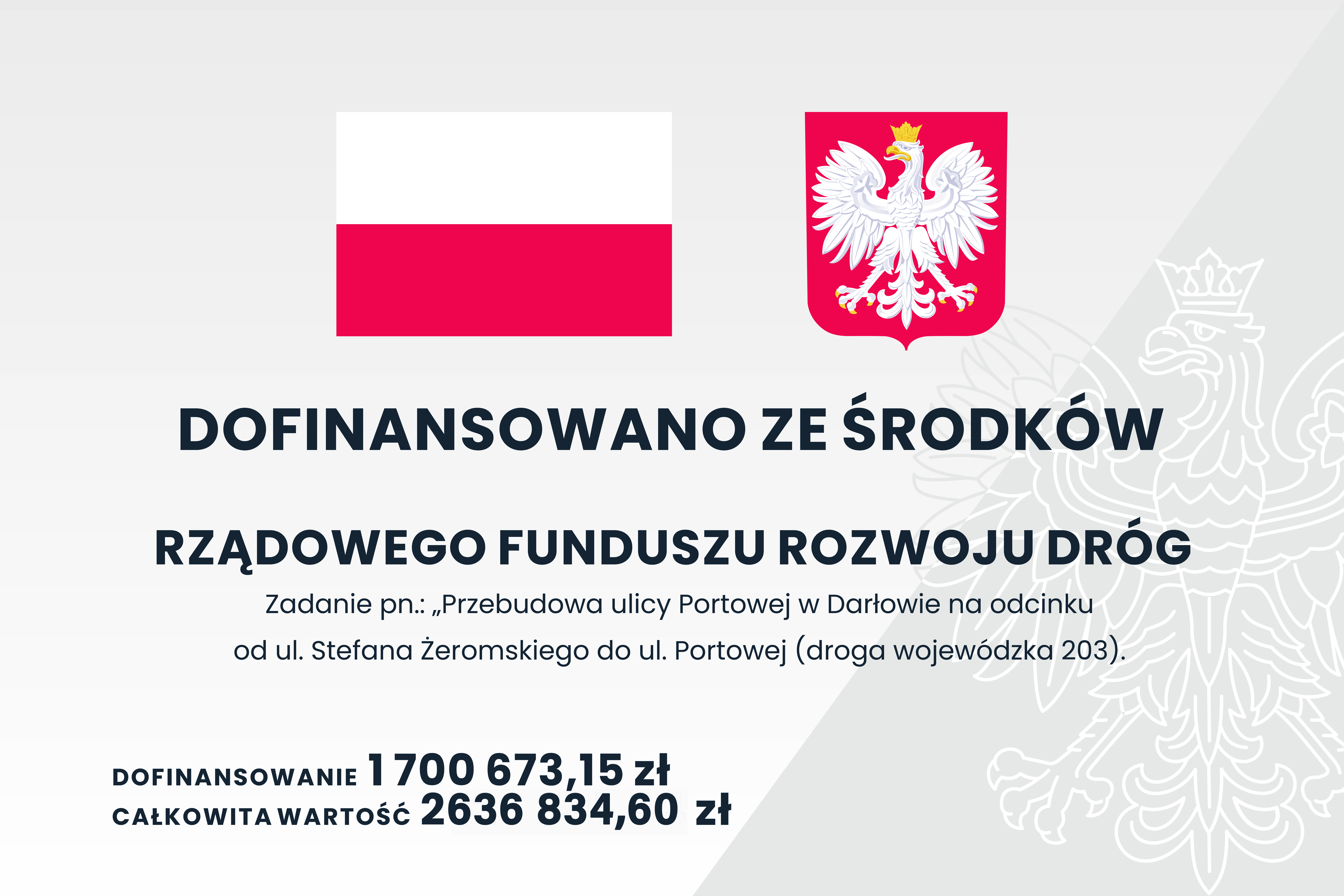 2. Zadanie pn. Przebudowa ul. Portowej w Darłowie na odcinku od ul. Stefana Żeromskiego do ul. Portowej (droga wojewódzka 203) dofinansowane z Rządowego Funduszu Rozwoju Dróg