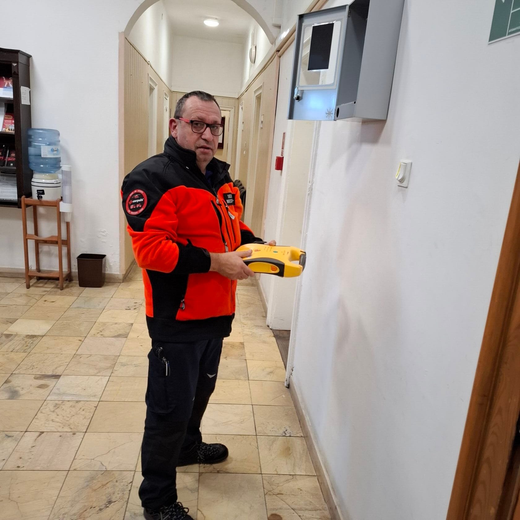 Technik serwisuje defibrylator w budynku