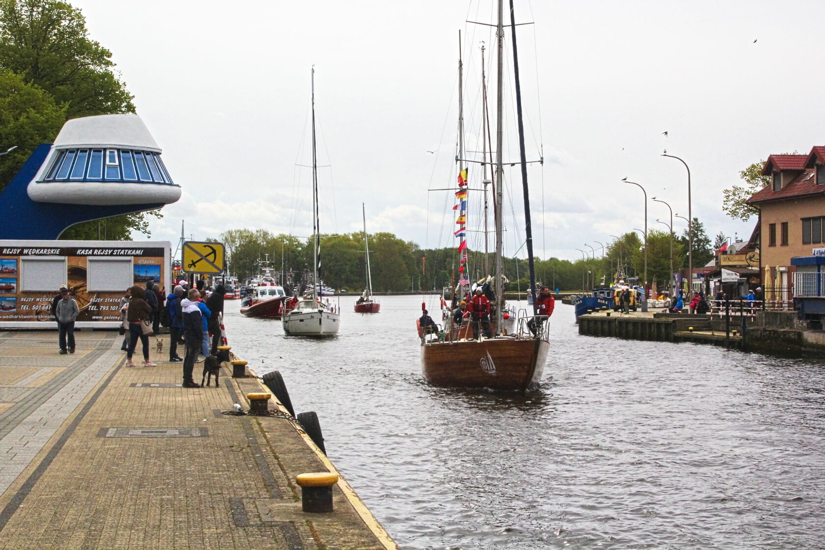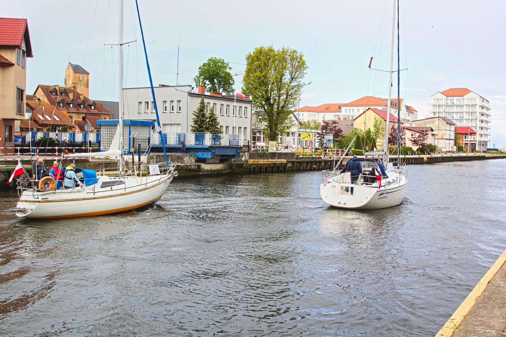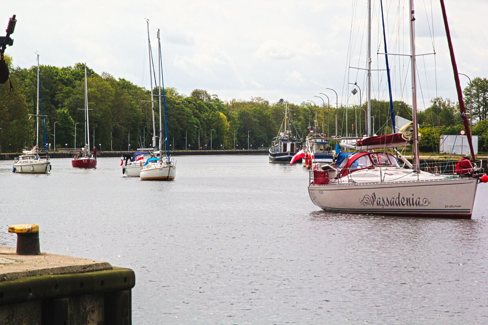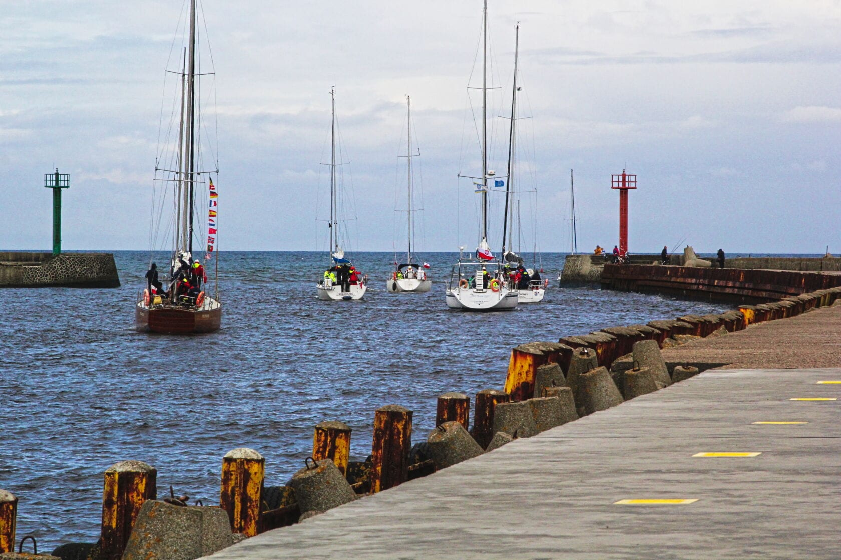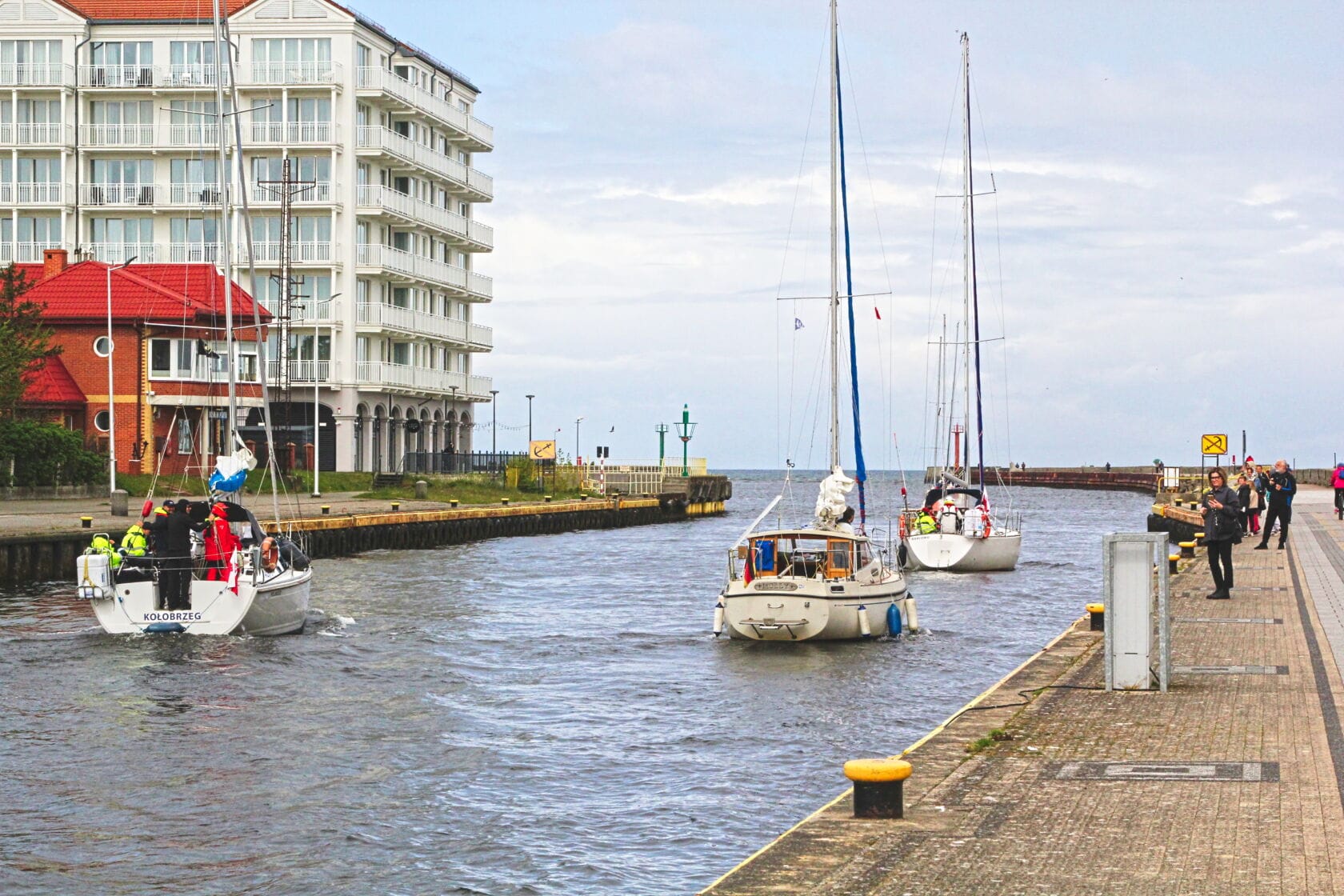 Żaglówki wpływające do portu przy nadmorskim bulwarze