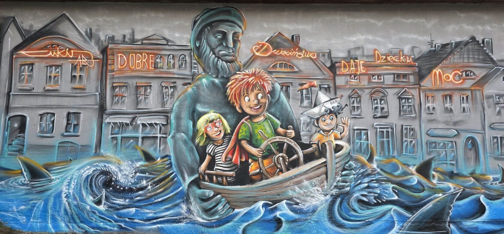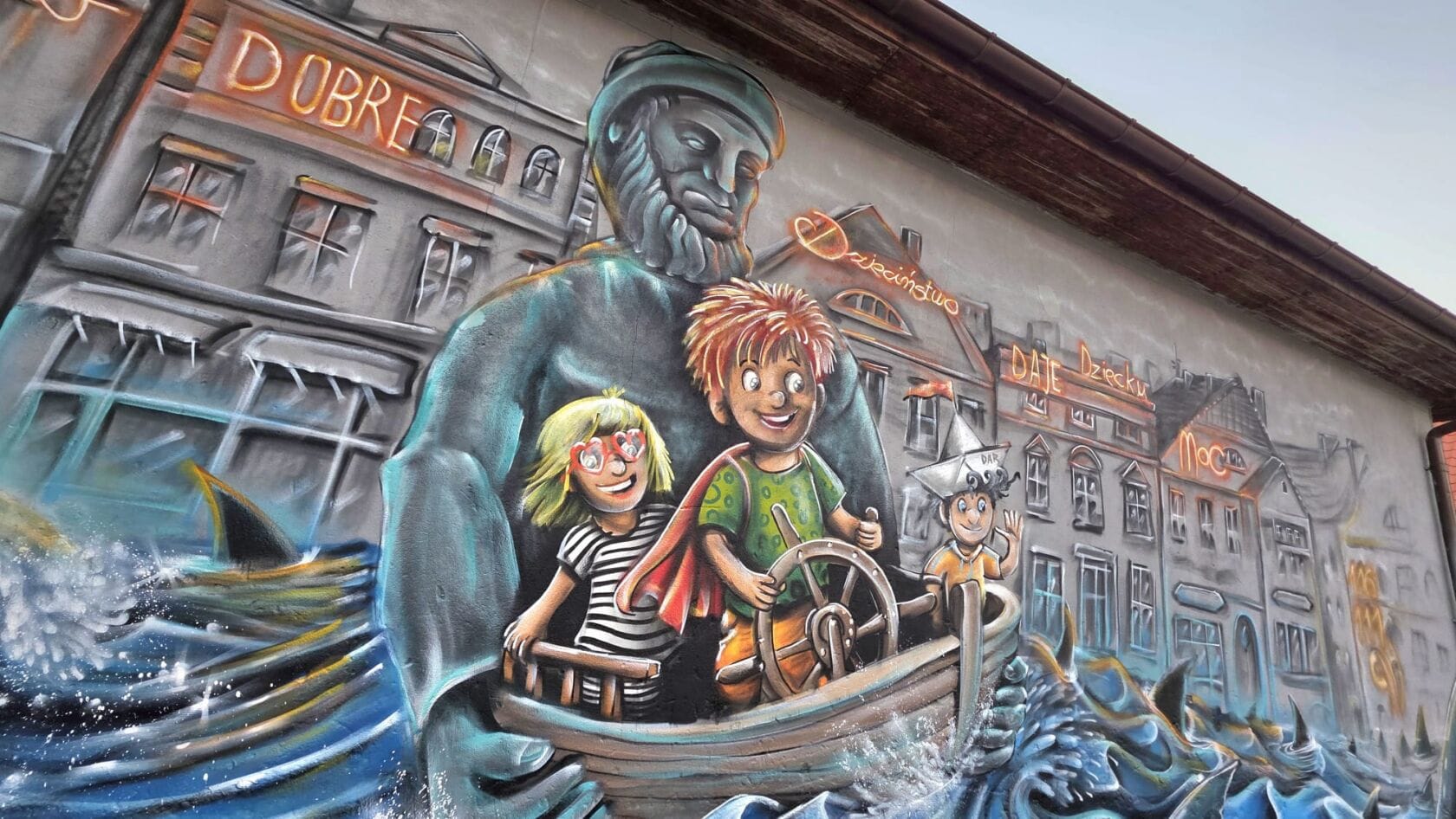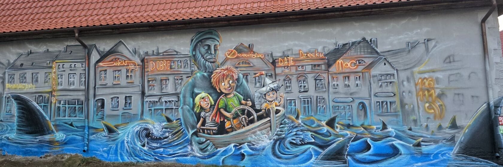 Na pierwszym planie artysta zdecydował się uwiecznić najbardziej znaną fontannę w mieście, a właściwie samą jej rzeźbę przedstawiającą rybaka. Stworzony za pomocą farby w sprayu słynny darłowski poławiacz dzielnie trzyma realistyczną łódź, za której sterami stoi trójka świetnie bawiących się dzieci. Podobnie jak w prawdziwym życiu i tak jak sugeruje hasło „Dzieciństwo bez przemocy” na najmłodszych czeka wiele niebezpieczeństw. Te zostały tu zaprezentowane w formie wzburzonego morza oraz wyłaniających się z fal – płetw rekinów. Na szczęście solidny monument darłowskiego rybaka bezpiecznie pozwala zmierzyć się bohaterom wizji Cukina z siłami żywiołu i wodnymi ssakami. W tle widać także charakterystyczne kamienice doskonale znane z Placu Tadeusza Kościuszki. Na malunku zawarte jest też hasło przewodnie „Dobre dzieciństwo daje dziecku moc”, które koszalinianin przedstawił za pomocą neonów. Nie zabrakło też m.in. numeru telefonu zaufania 116 111.
