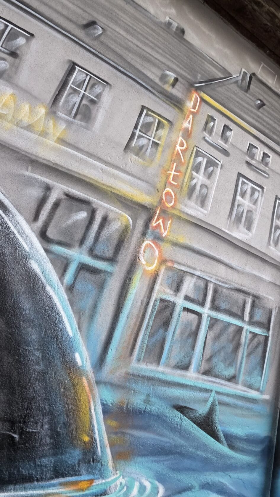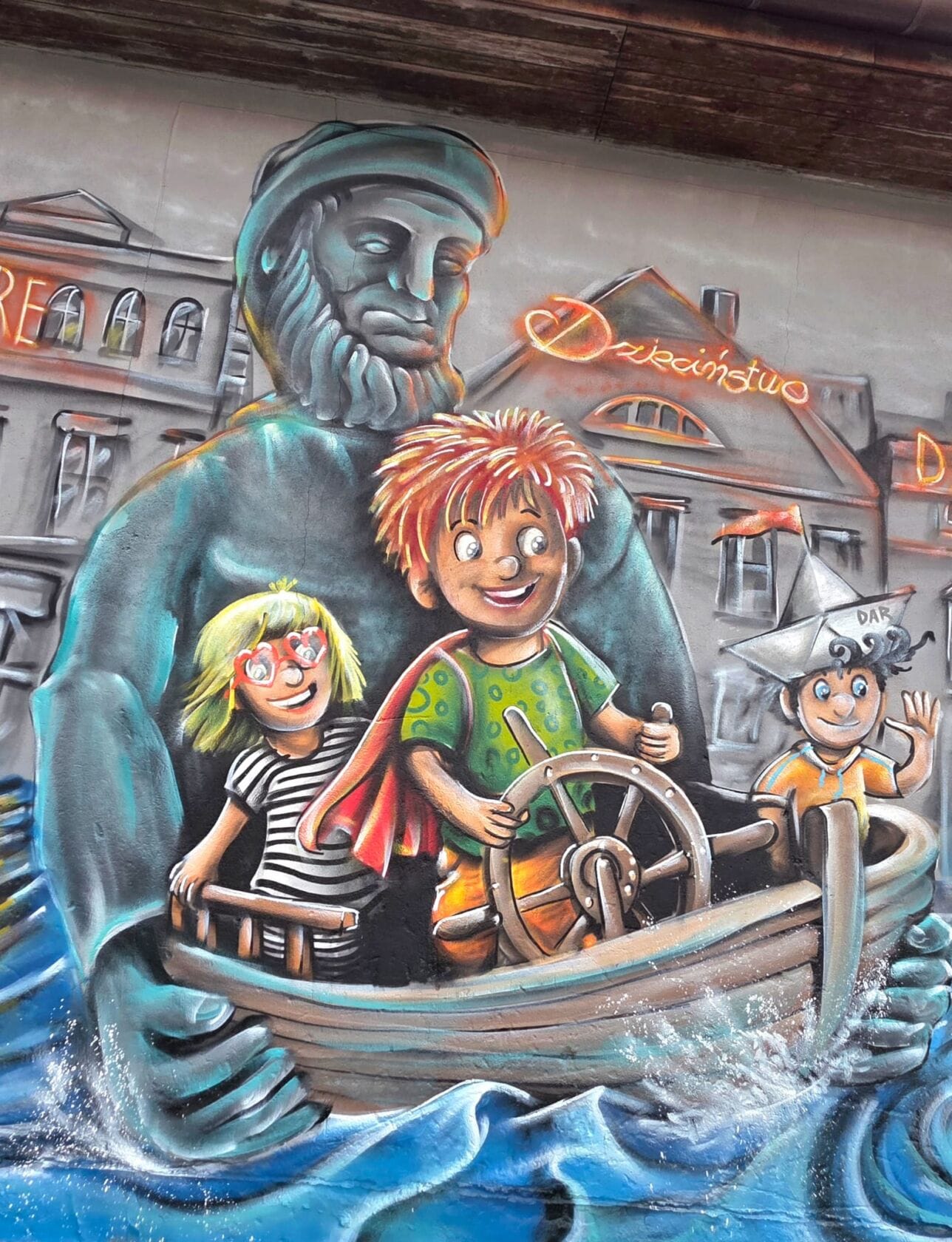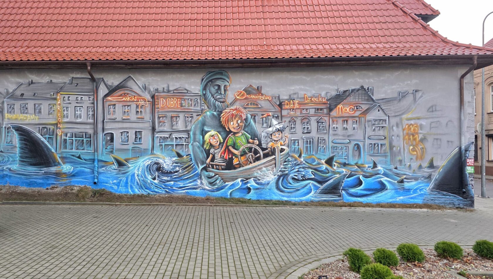 Na pierwszym planie artysta zdecydował się uwiecznić najbardziej znaną fontannę w mieście, a właściwie samą jej rzeźbę przedstawiającą rybaka. Stworzony za pomocą farby w sprayu słynny darłowski poławiacz dzielnie trzyma realistyczną łódź, za której sterami stoi trójka świetnie bawiących się dzieci. Podobnie jak w prawdziwym życiu i tak jak sugeruje hasło „Dzieciństwo bez przemocy” na najmłodszych czeka wiele niebezpieczeństw. Te zostały tu zaprezentowane w formie wzburzonego morza oraz wyłaniających się z fal – płetw rekinów. Na szczęście solidny monument darłowskiego rybaka bezpiecznie pozwala zmierzyć się bohaterom wizji Cukina z siłami żywiołu i wodnymi ssakami. W tle widać także charakterystyczne kamienice doskonale znane z Placu Tadeusza Kościuszki. Na malunku zawarte jest też hasło przewodnie „Dobre dzieciństwo daje dziecku moc”, które koszalinianin przedstawił za pomocą neonów. Nie zabrakło też m.in. numeru telefonu zaufania 116 111.