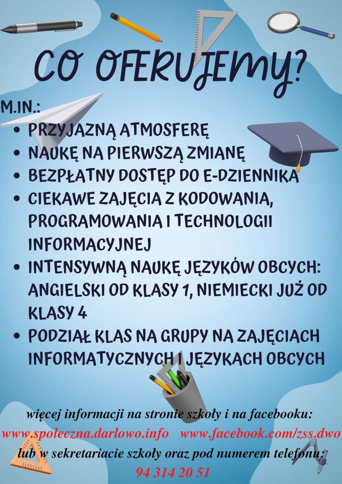 Społeczna Szkoła Podstawowa im. Lotników Morskich STO w Darłówku poszukuje kandydatów do klasy pierwszej, dla których: