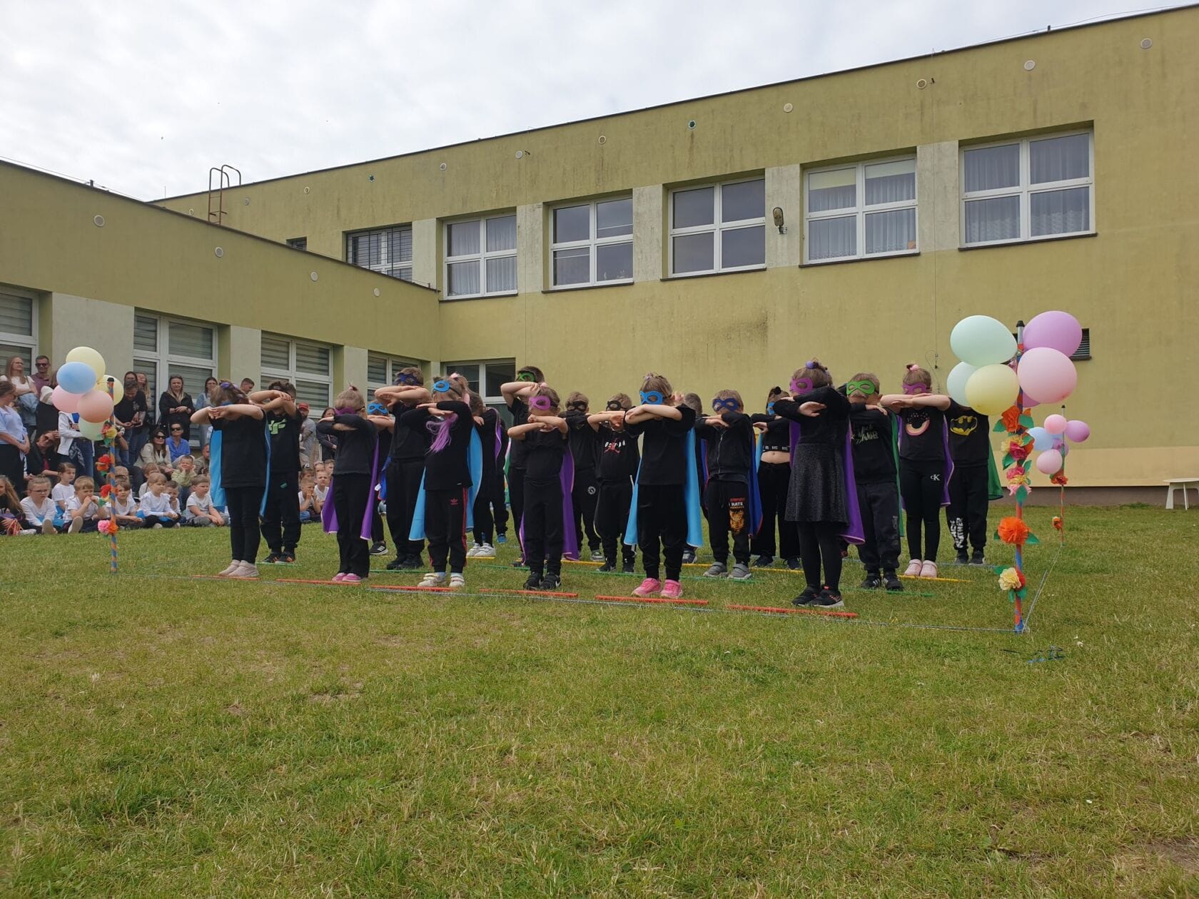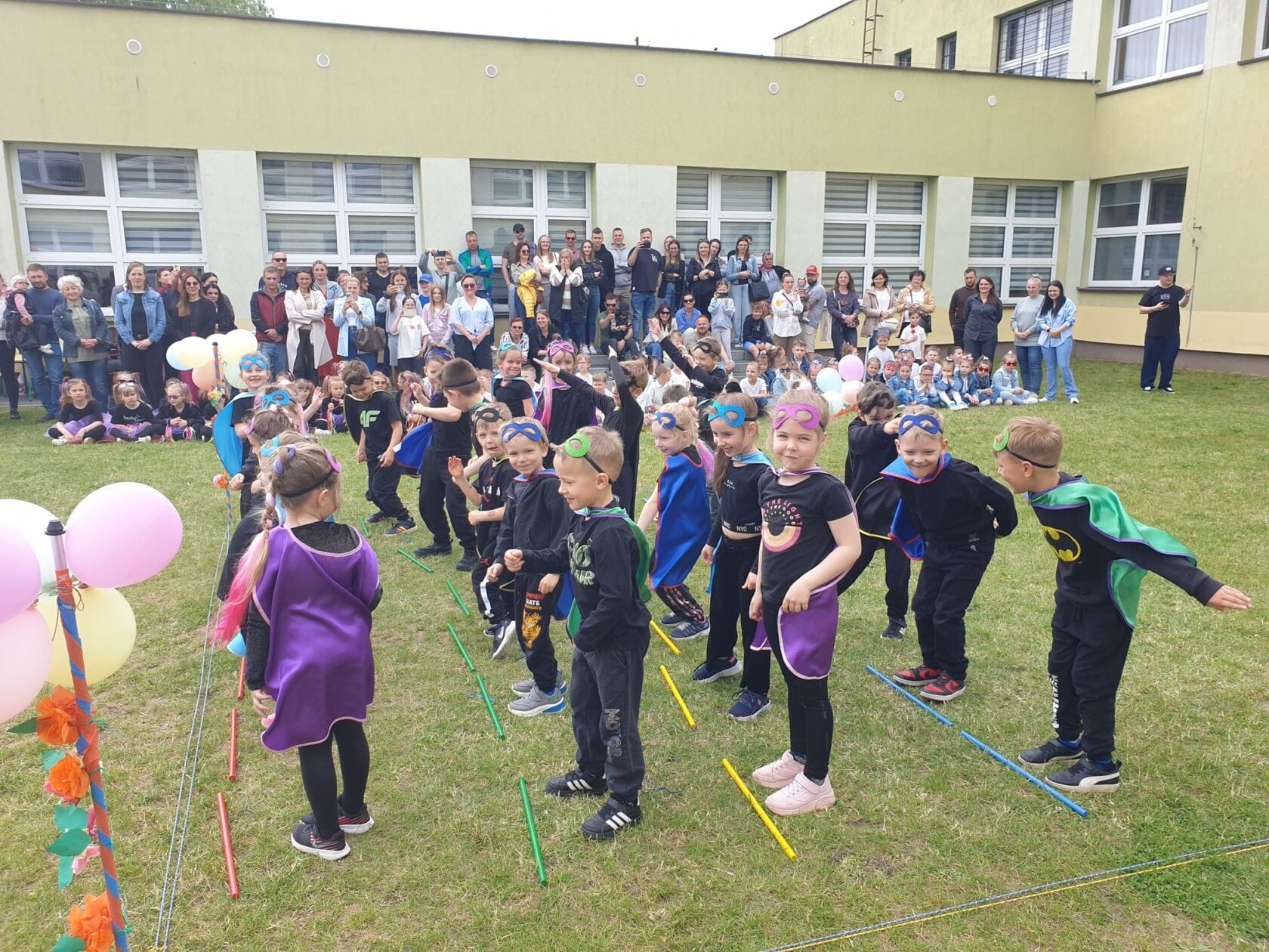 Dzieci w kostiumach superbohaterów bawią się na szkolnym festynie
