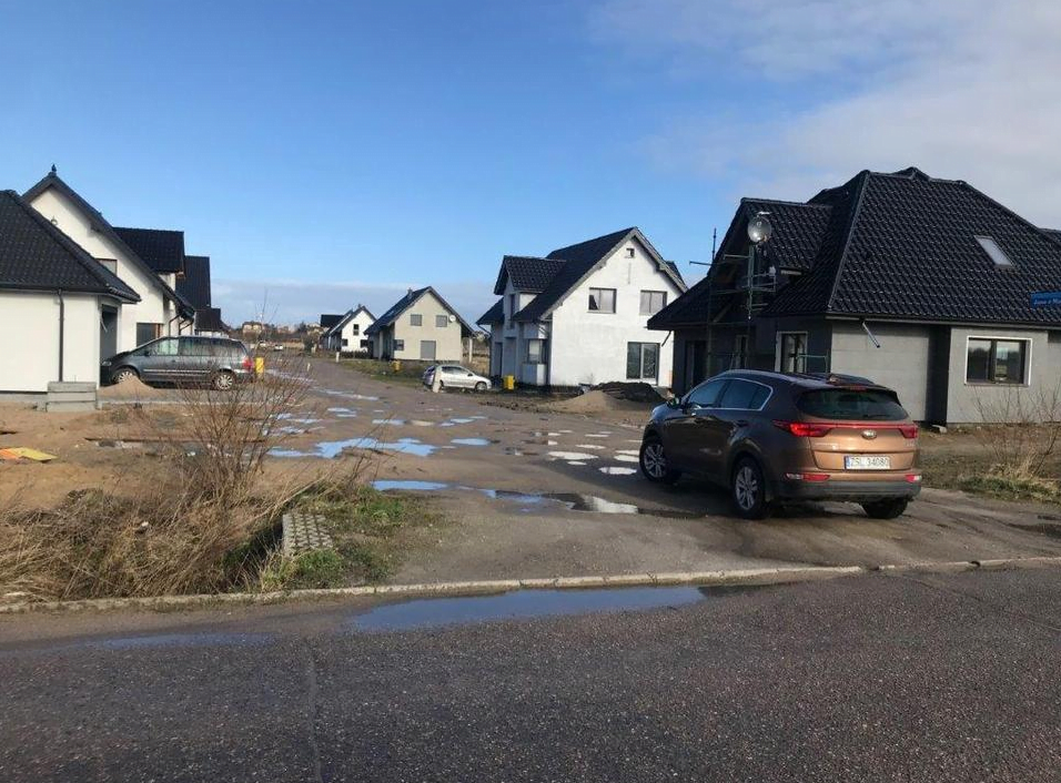 Osiedle domów jednorodzinnych z samochodami i kałużami