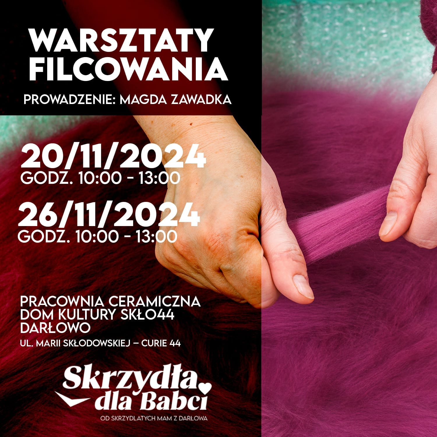 Przypominamy – realizacja projektu Skrzydła dla Babci – przewiduje dwa, trzygodzinne spotkania z filcem, w ramach których Uczestniczki stworzą własną pracę. To co powstanie – pokażemy podczas wernisażu, który został zaplanowany na dzień 18 stycznia 2025 w Galerii Rybackiej i Marynistycznej SKŁO44. Wydarzenie to będzie miało charakter otwarty.
