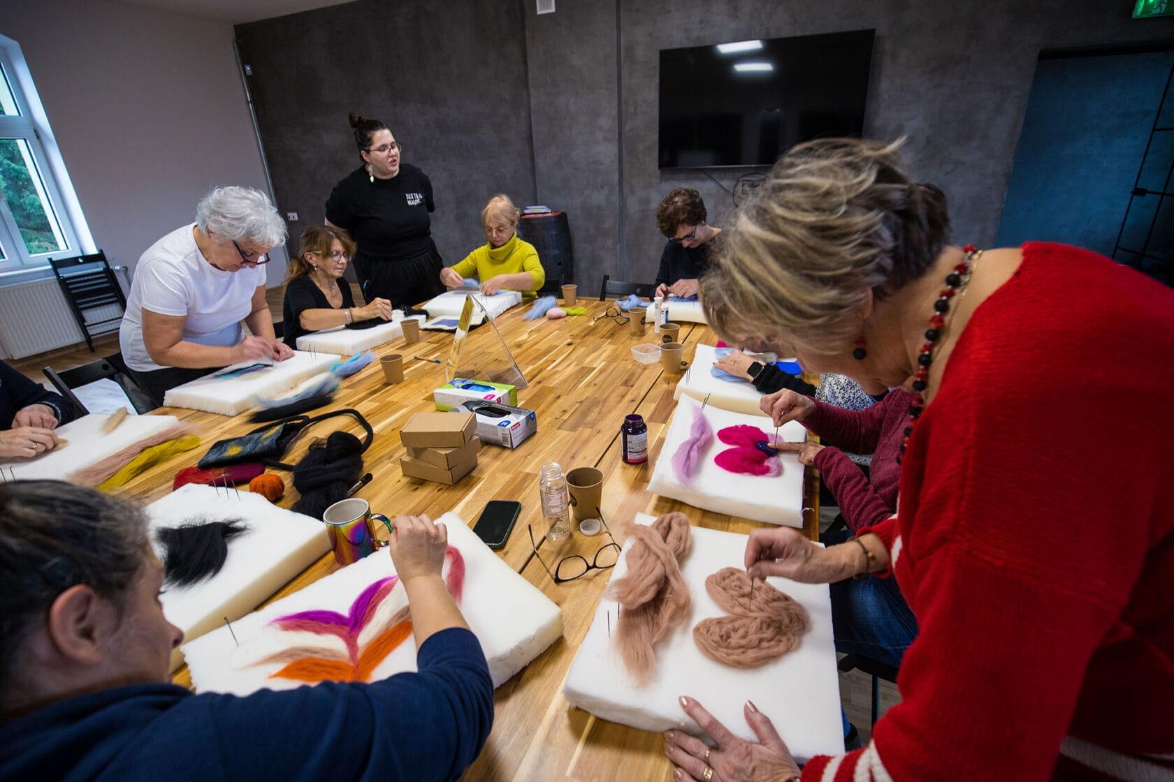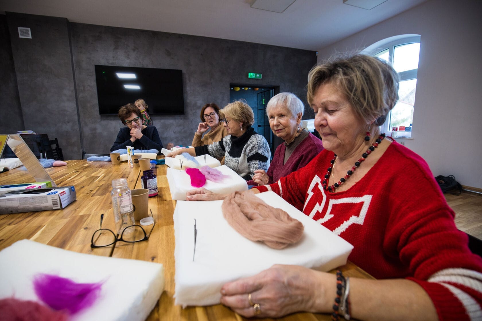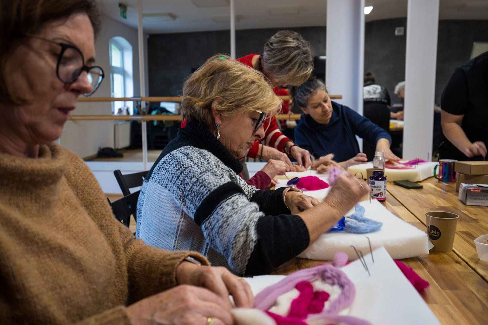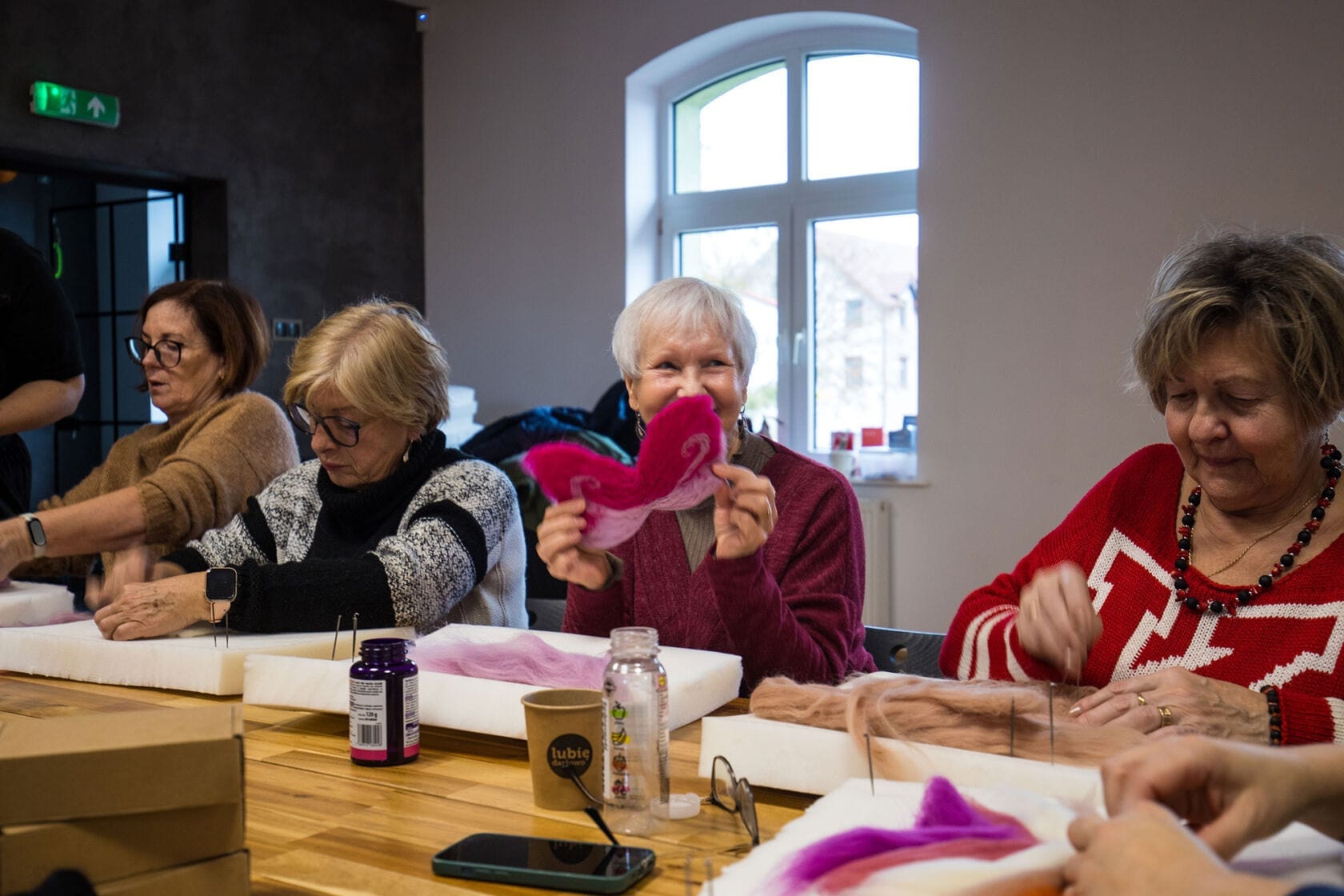 Szczęśliwe i zaangażowane Skrzydlate Babcie z Darłowa, dziś przystąpiły do kolejnych zajęć. Tym razem czekała na nie wełna oraz nasza instruktor – Magdalena Zawadka, która zapoznała uczestniczki z podstawami rzemiosła jakim jest filcowanie. Dziś było na sucho – to jedna z metod, kolejne spotkanie przewiduje także naukę mokrej techniki tego rękodzieła.