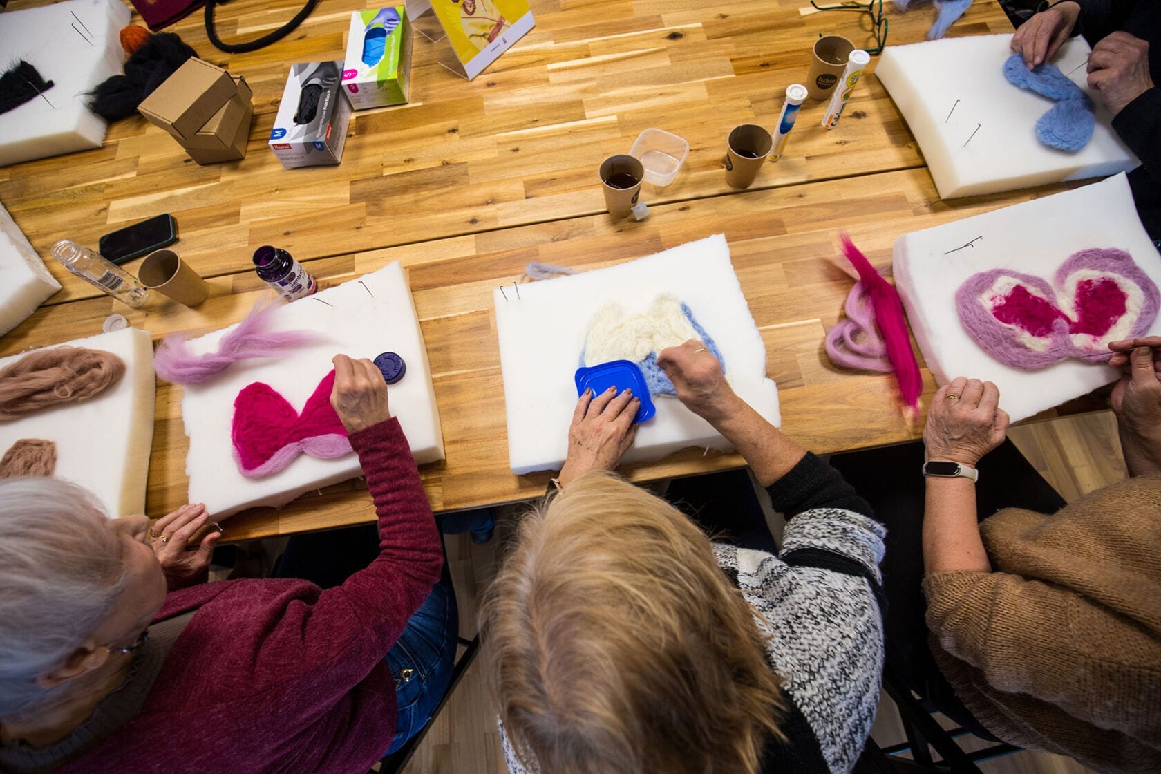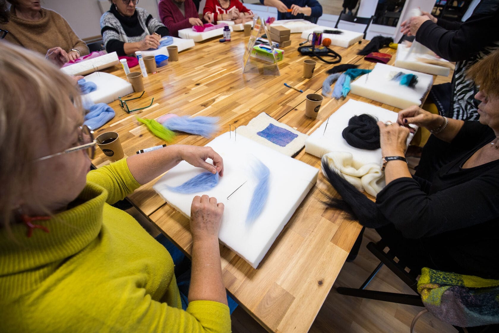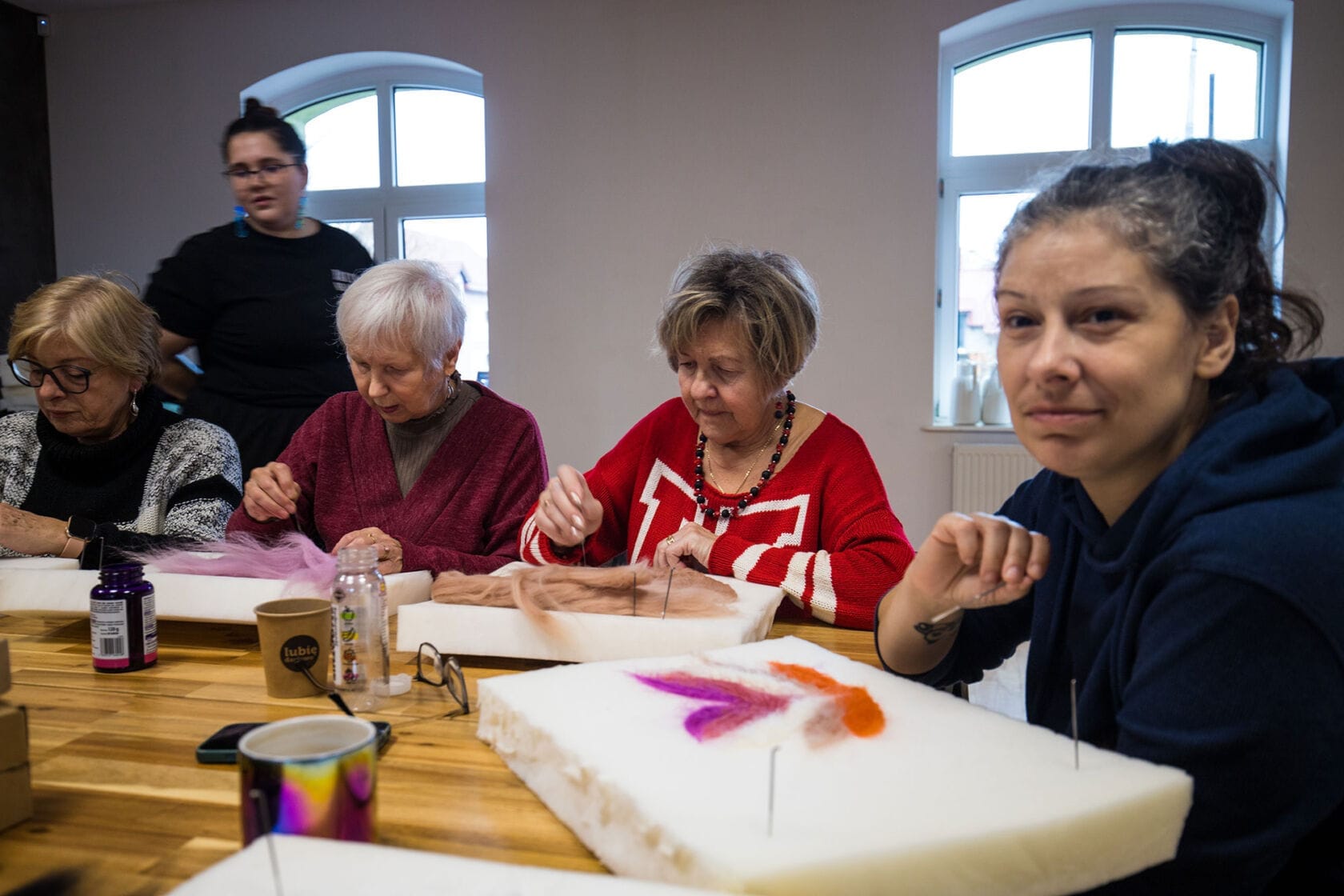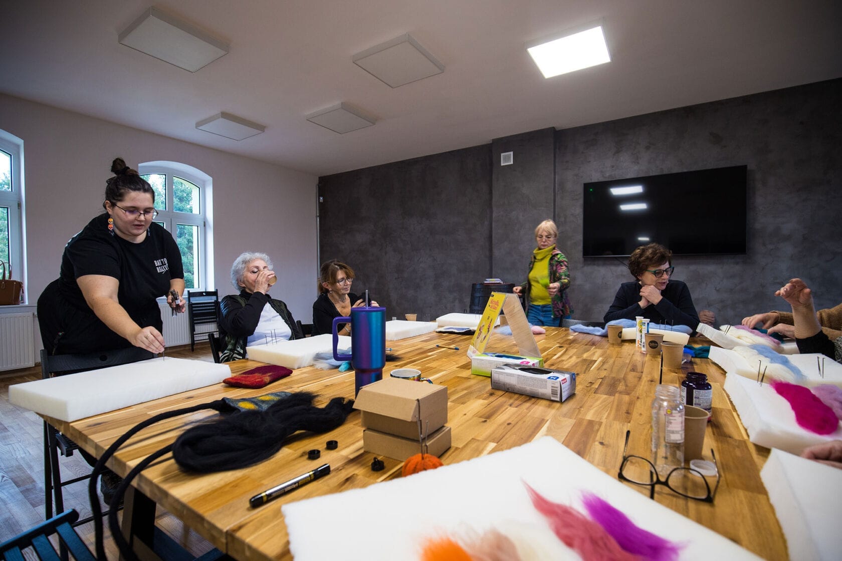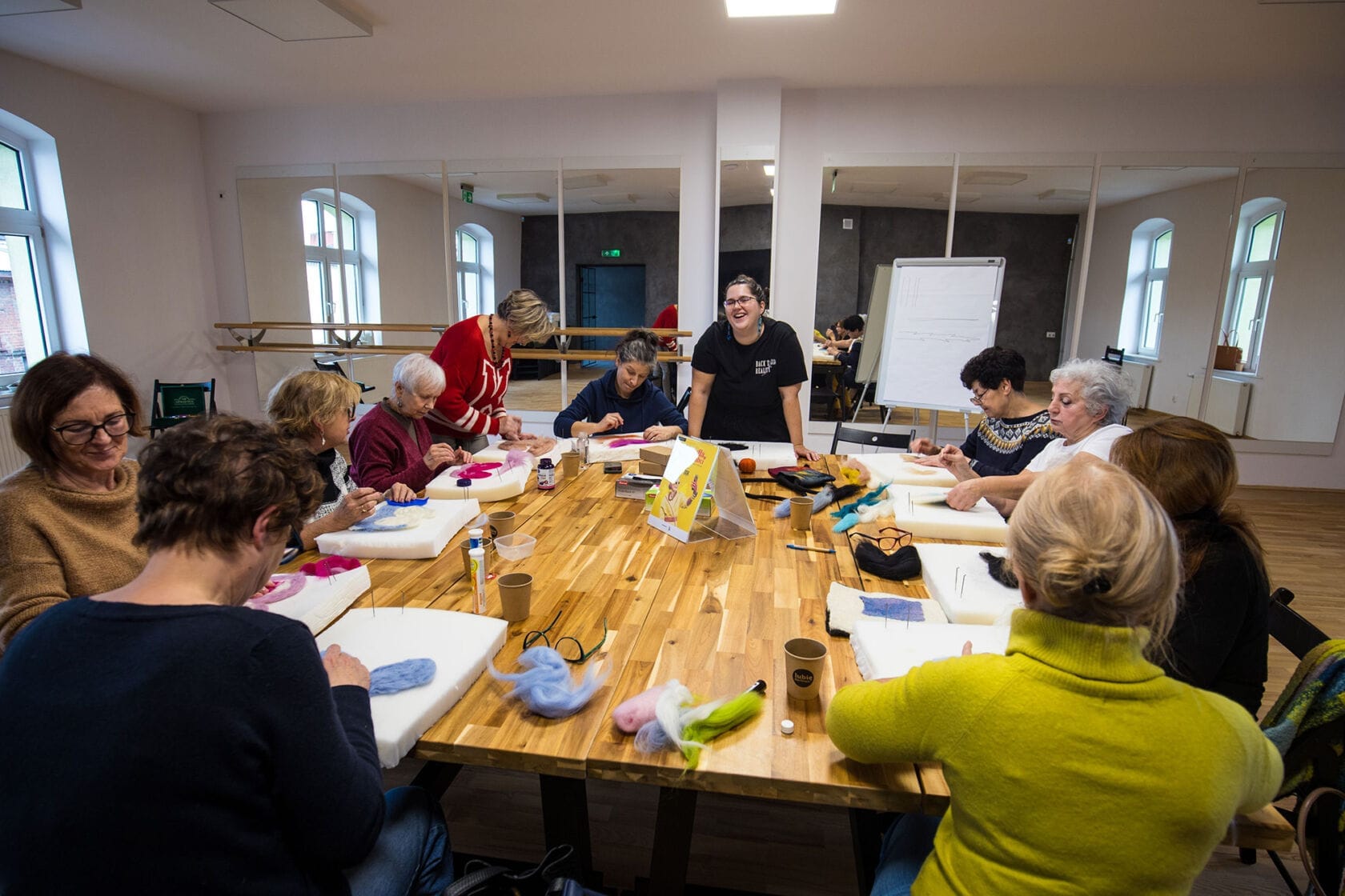 Szczęśliwe i zaangażowane Skrzydlate Babcie z Darłowa, dziś przystąpiły do kolejnych zajęć. Tym razem czekała na nie wełna oraz nasza instruktor – Magdalena Zawadka, która zapoznała uczestniczki z podstawami rzemiosła jakim jest filcowanie. Dziś było na sucho – to jedna z metod, kolejne spotkanie przewiduje także naukę mokrej techniki tego rękodzieła.