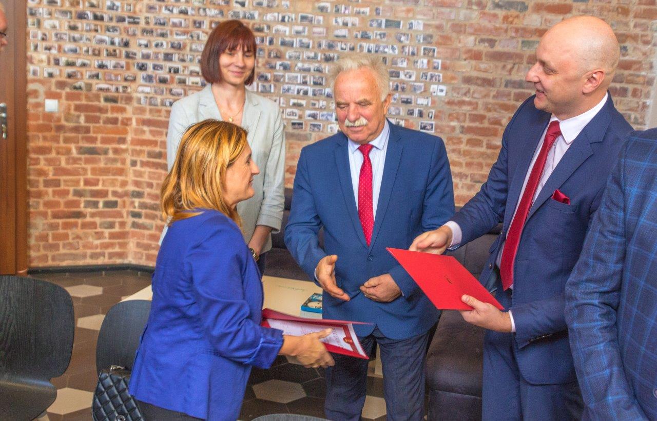 Mężczyźni wręczają dokumenty podczas uroczystości wewnątrz budynku