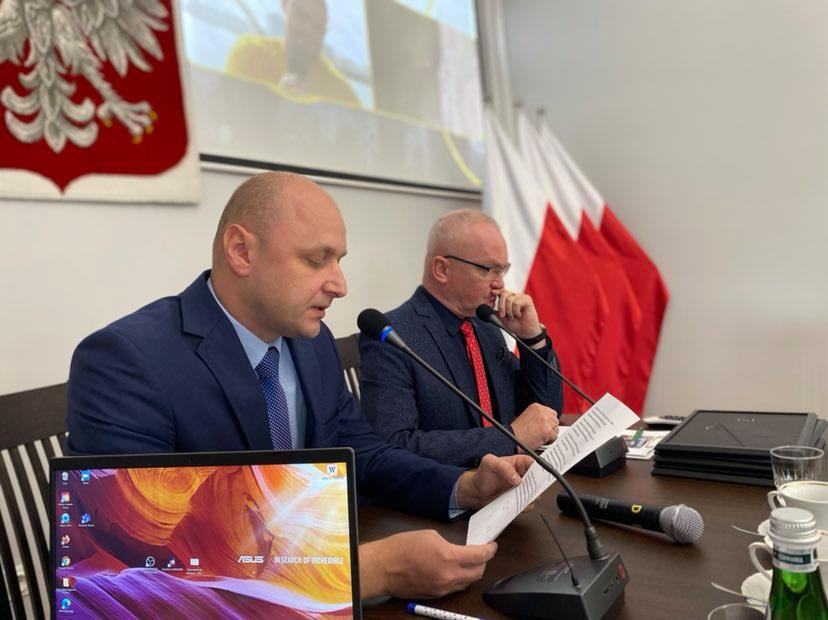 Spotkanie oficjalne osób przy długim stole, flagi Polski