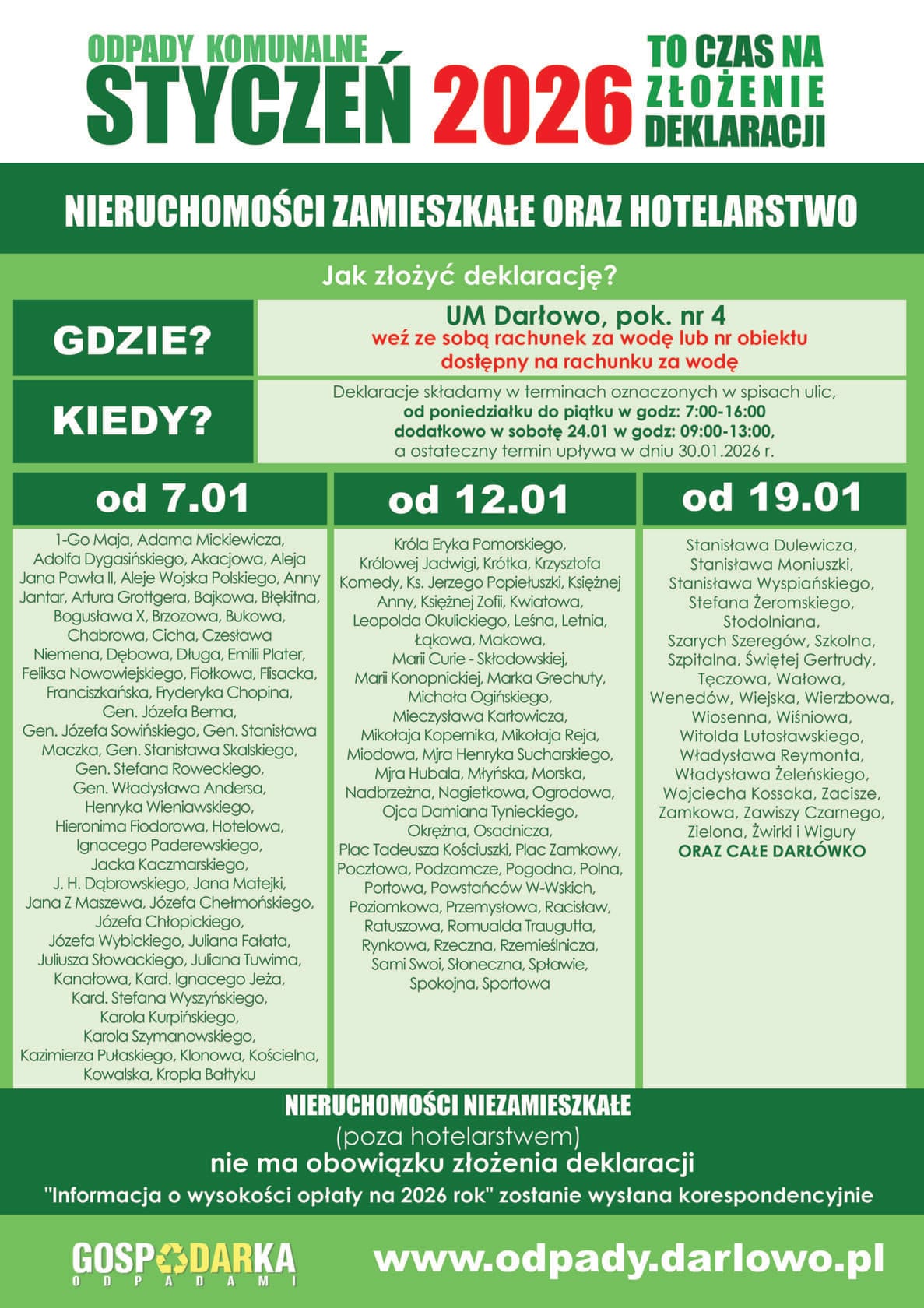 W styczniu 2026 roku mieszkańcy Darłowa oraz właściciele obiektów hotelarskich zobowiązani są do złożenia deklaracji dotyczącej opłaty za gospodarowanie odpadami komunalnymi. Obowiązek ten dotyczy nieruchomości zamieszkałych oraz bazy noclegowej funkcjonującej na terenie miasta.