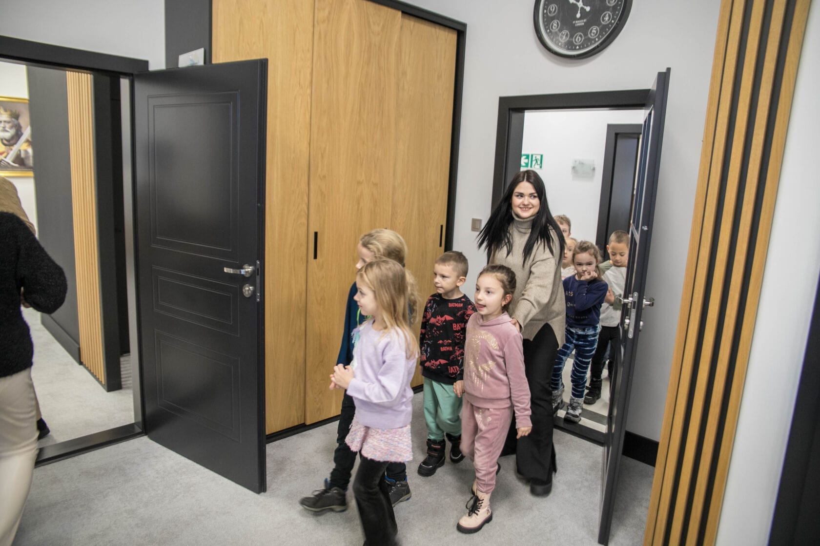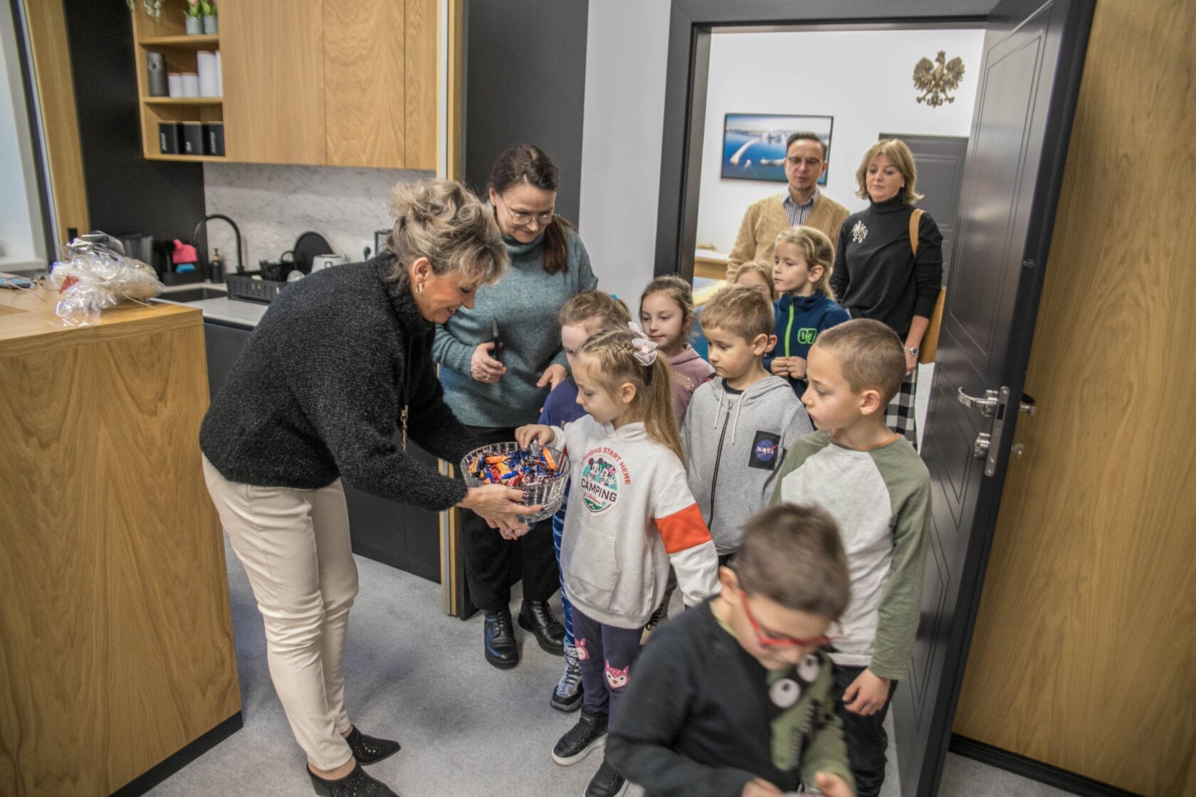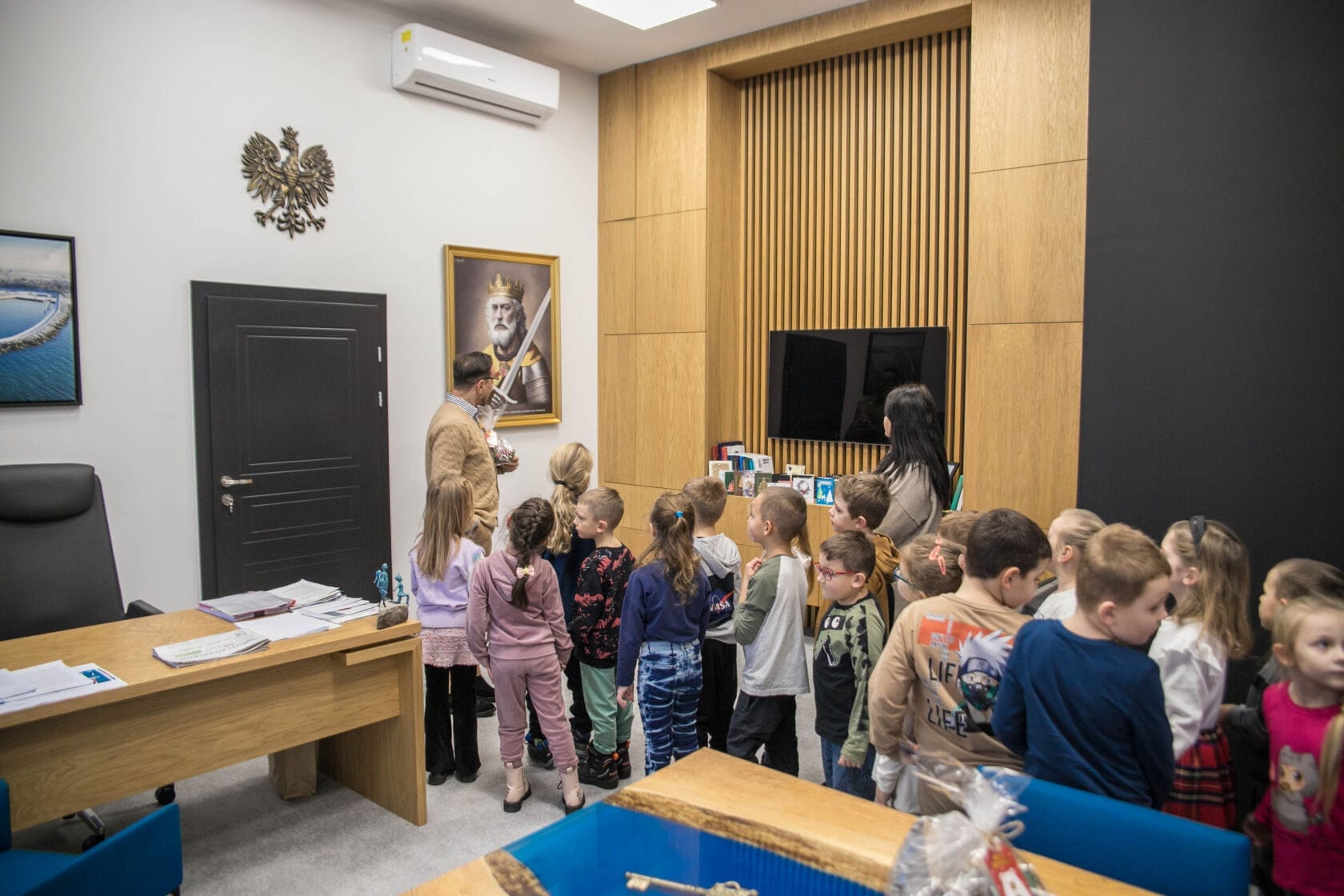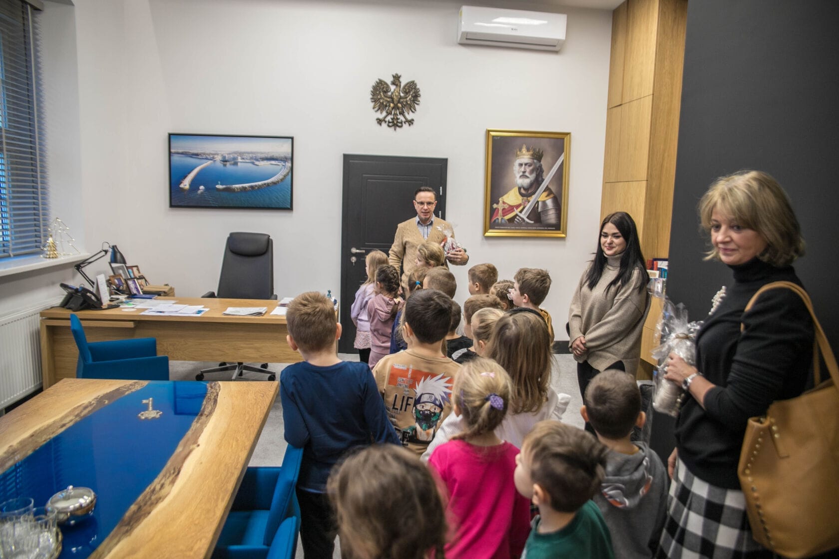 Przedszkolaki przygotowały także drobne upominki. W ramach podziękowania Zastępca Burmistrza Krzysztof Walkow oprowadził małych gości po gabinecie burmistrza, pokazując, jak wygląda praca w urzędzie.