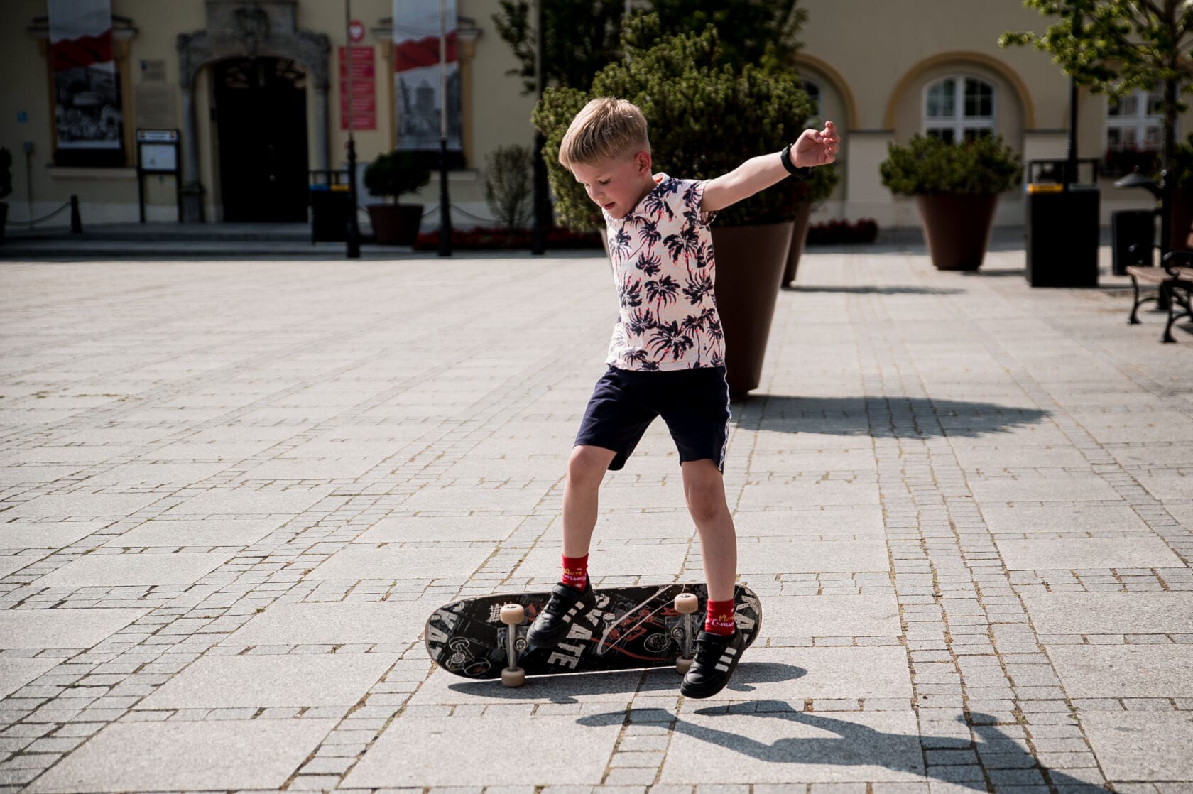Dzieci uczą się jazdy na deskorolce na miejskim placu